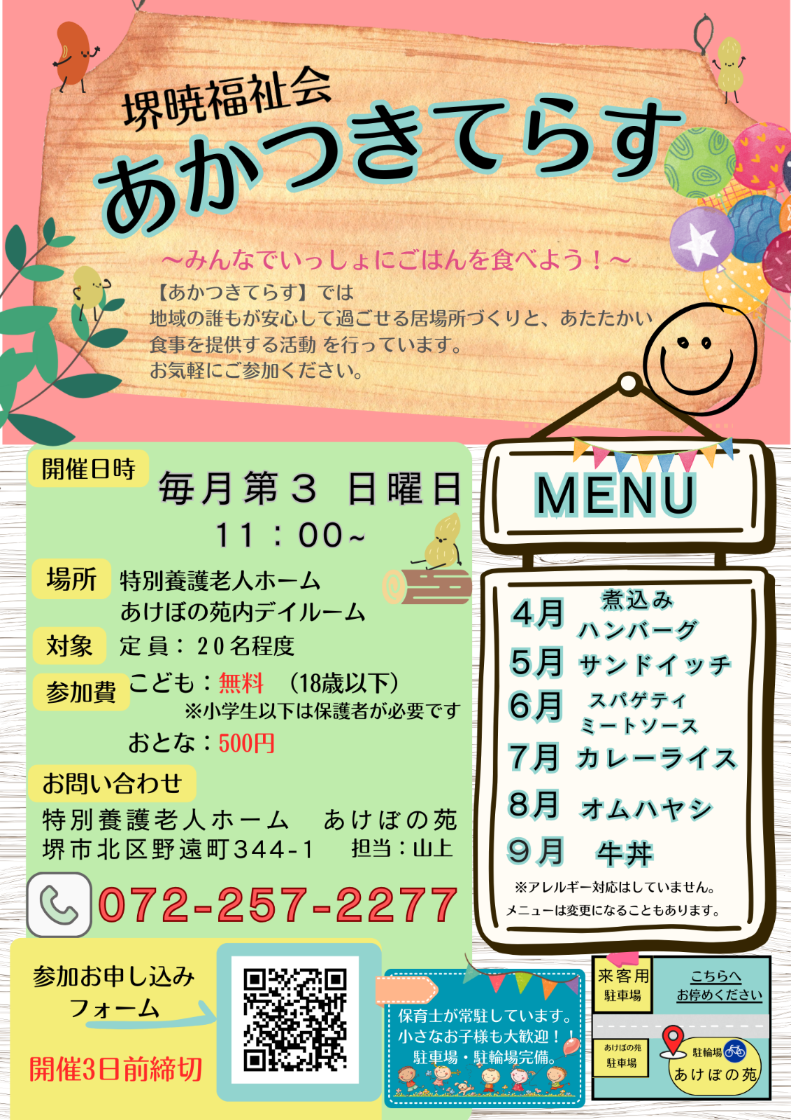 堺暁福祉会では、地域の皆様が気軽にご参加いただける活動として「あかつきてらす」を開催しています。 「てらす」には、みんなが集う「テラス(縁側)」のような場所、また地域全体を明るく「照らす」場所になりたいという思いを込めました。 毎月第3日曜日にあけぼの苑で工作等のイベントと温かい食事を地域の皆様と共に楽しむ集いの場です。お気軽にご参加ください。 食数を把握し、食品ロスを削減するために事前予約にご協力ください。