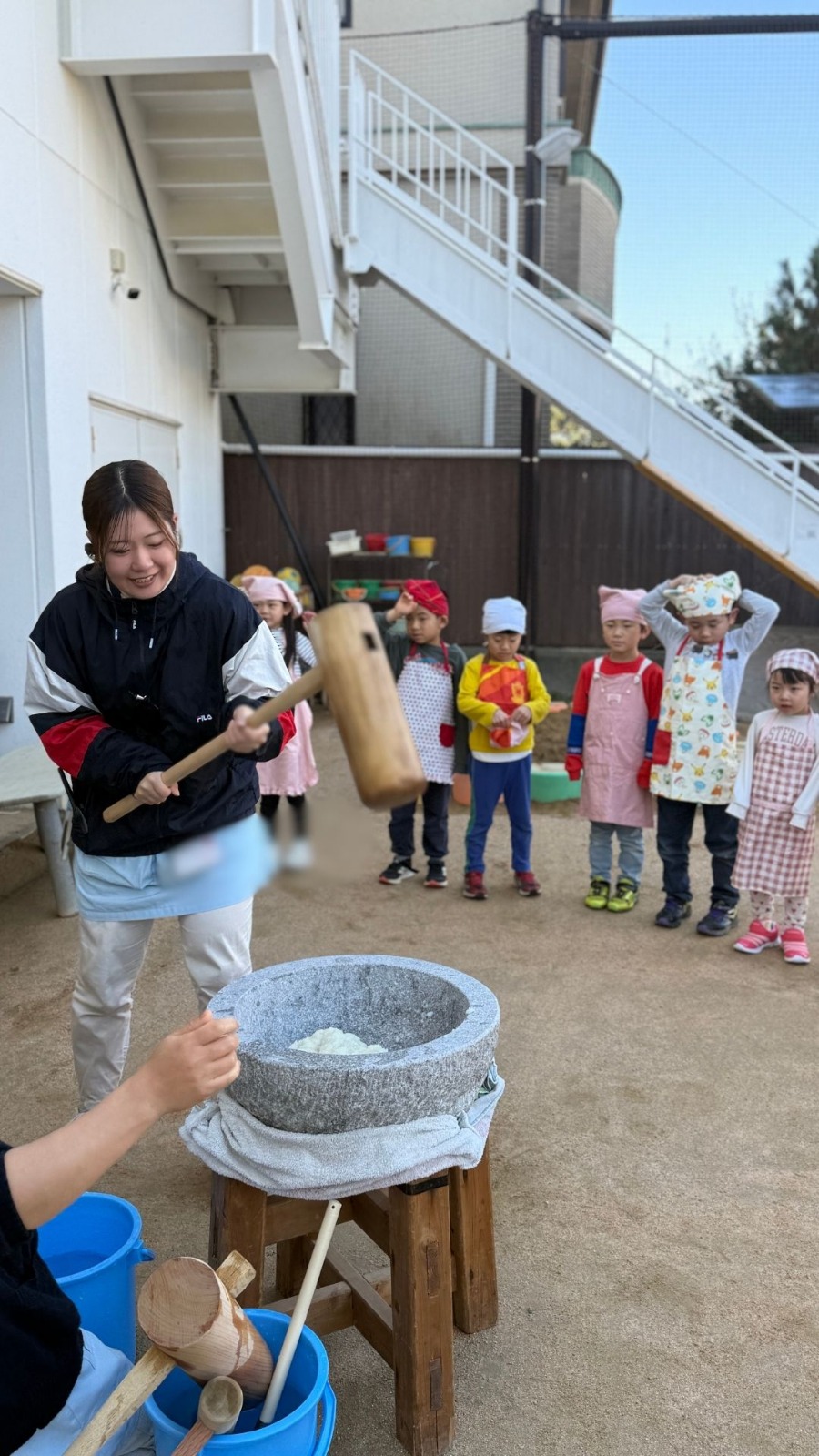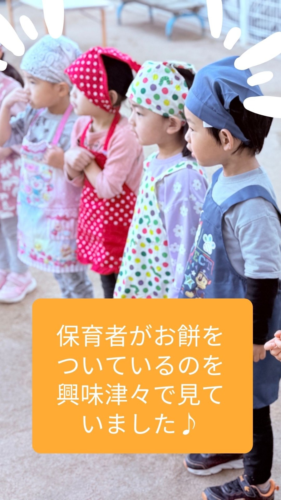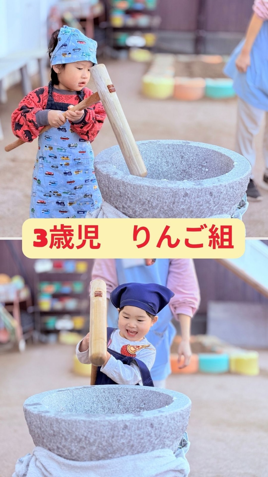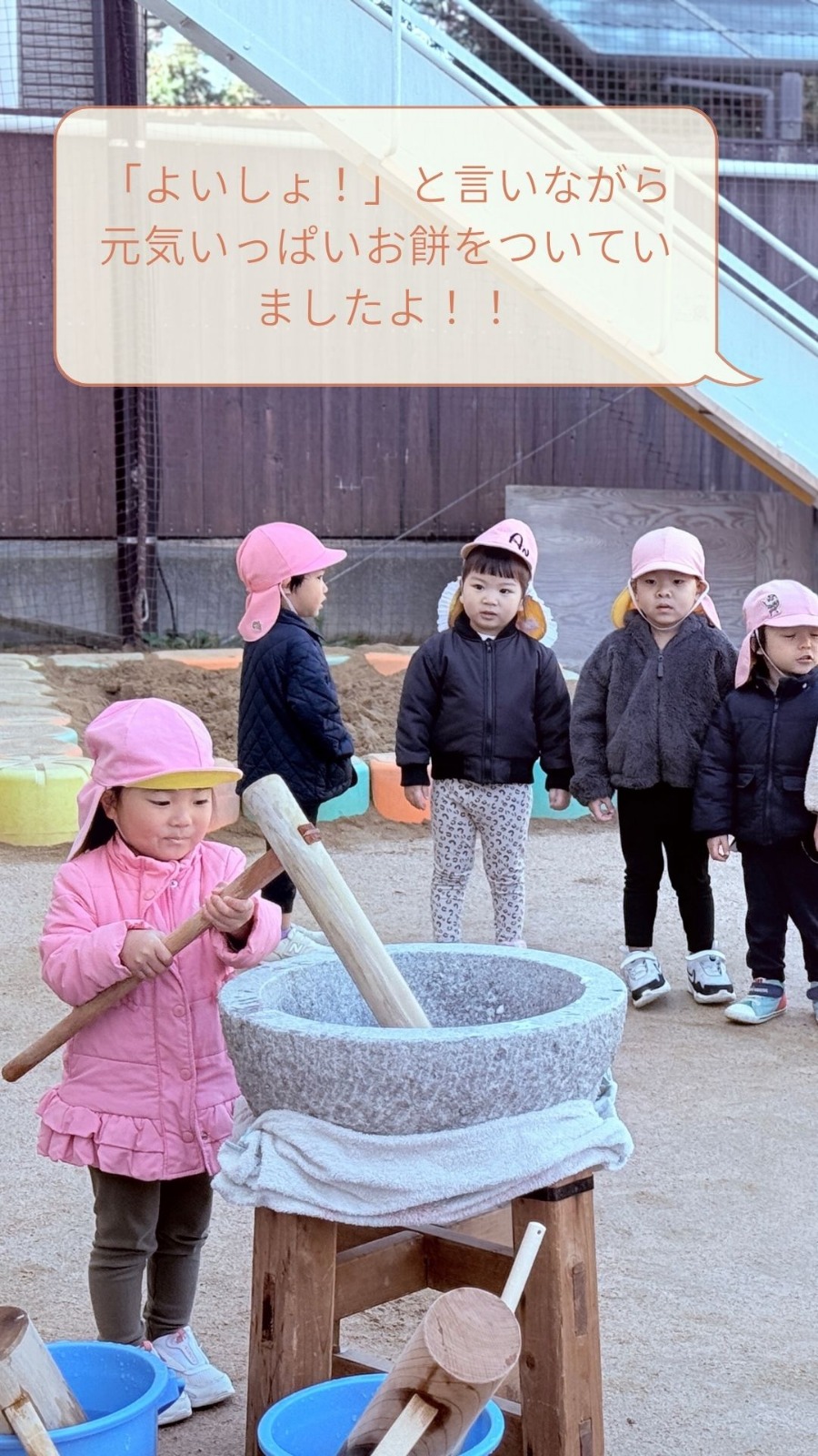 12月23日(火)おもちつき会がありました🤩「よいしょ!!」「よいしょ!!」と掛け声をかけながら友達や保育者がつくのを応援したり、杵を持って一生懸命、お餅をついたりしていました!!お餅を丸める時も「めっちゃきれいに丸めたで!!」と見せてくれていました!! 保育園の様子はこちら(インスタグラム)でご覧ください。