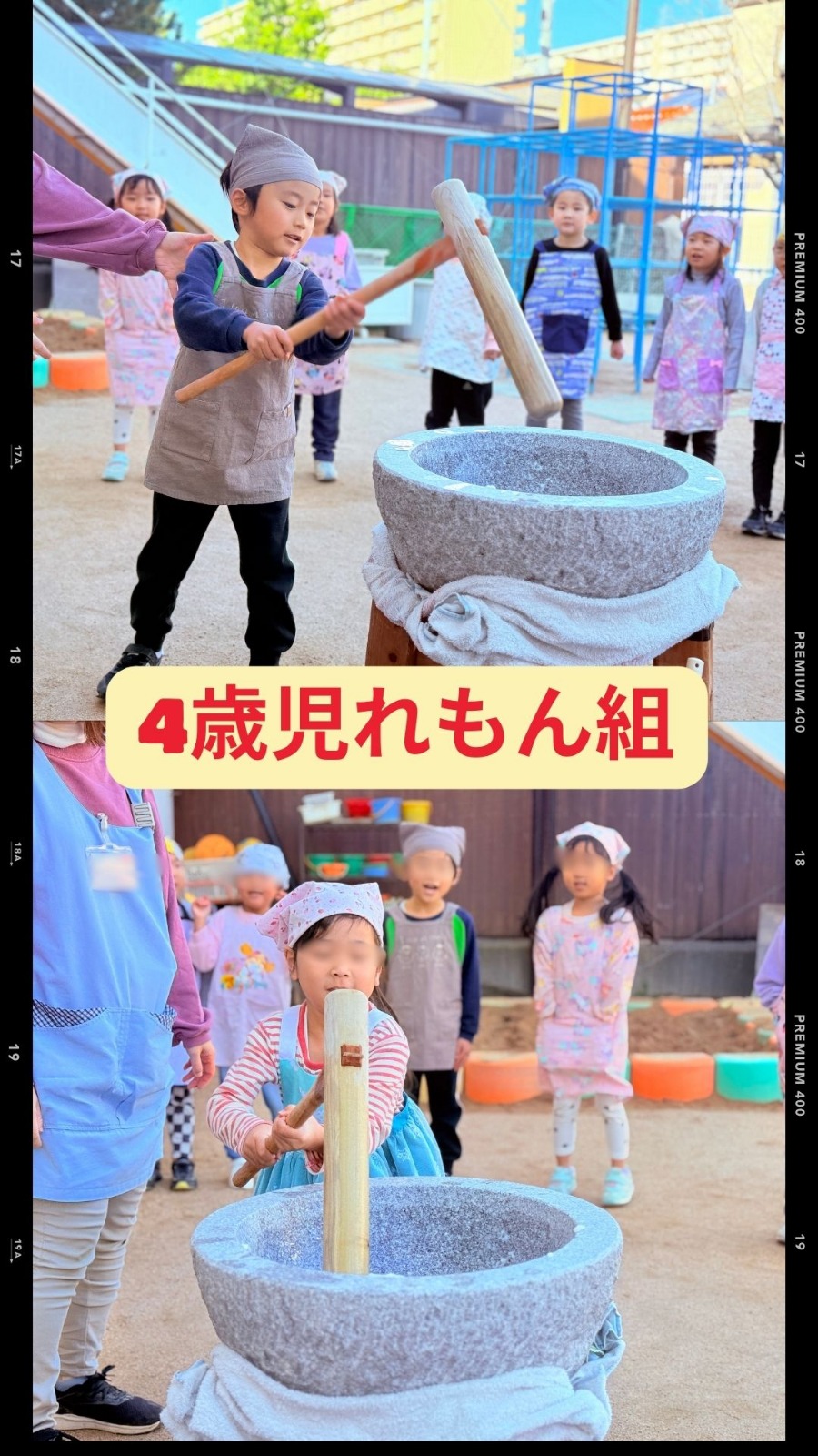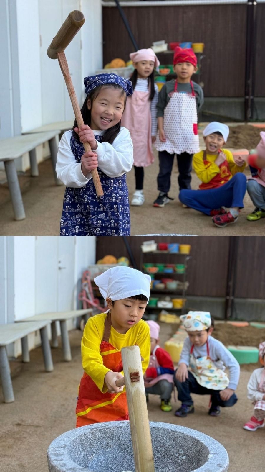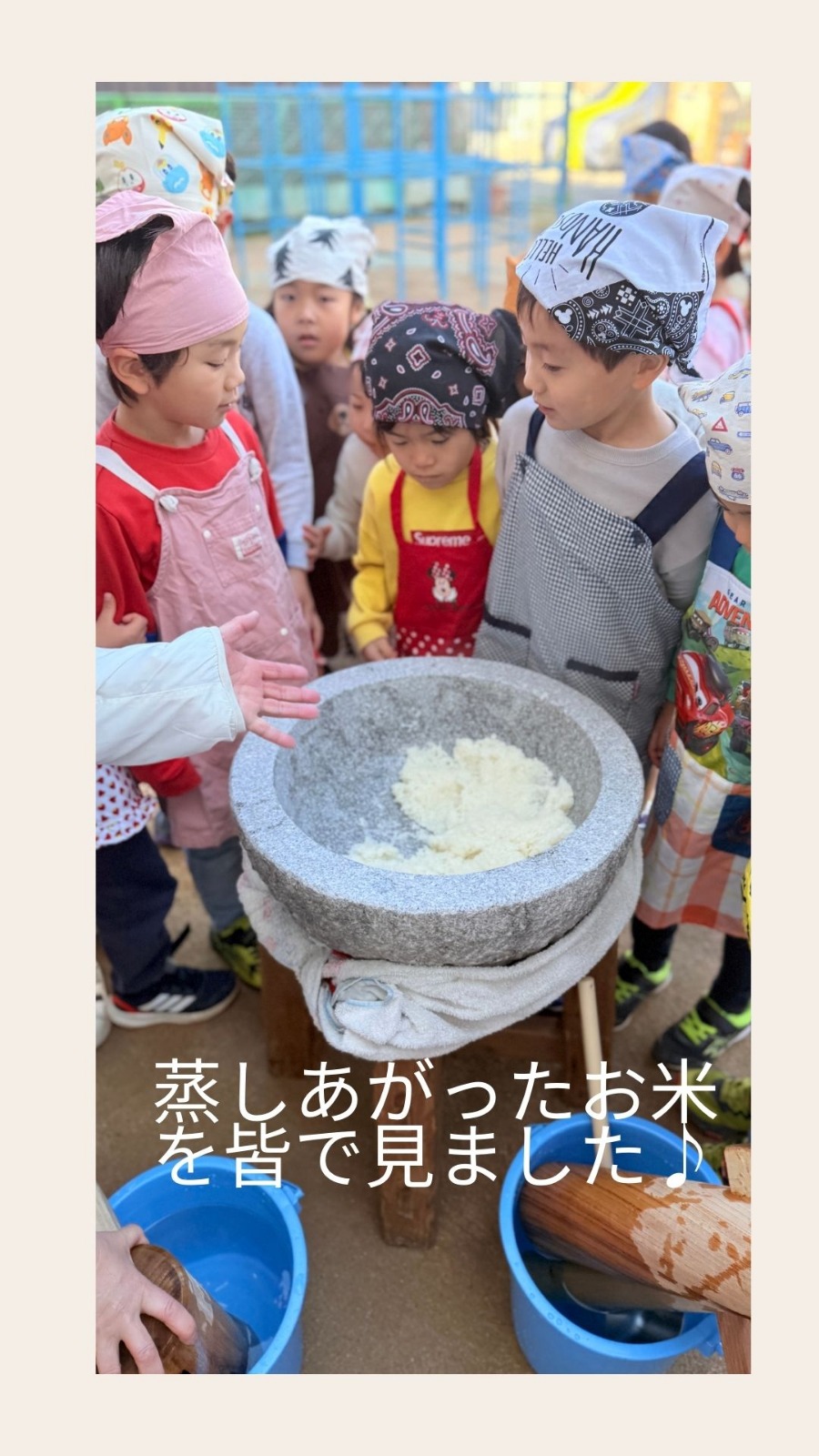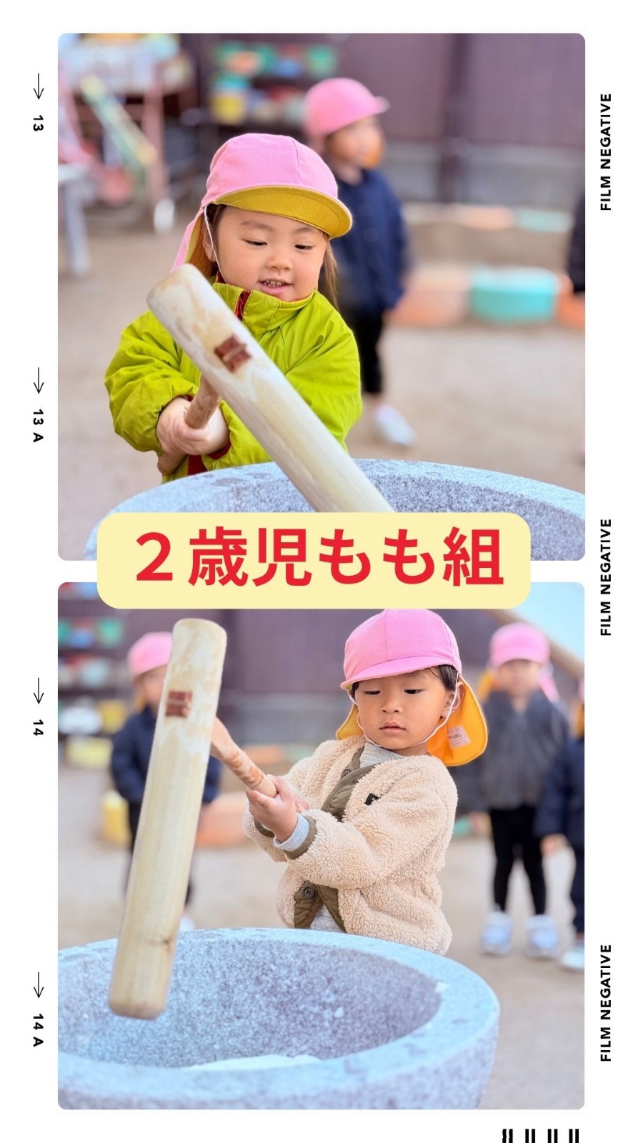 12月23日(火)おもちつき会がありました🤩「よいしょ!!」「よいしょ!!」と掛け声をかけながら友達や保育者がつくのを応援したり、杵を持って一生懸命、お餅をついたりしていました!!お餅を丸める時も「めっちゃきれいに丸めたで!!」と見せてくれていました!! 保育園の様子はこちら(インスタグラム)でご覧ください。