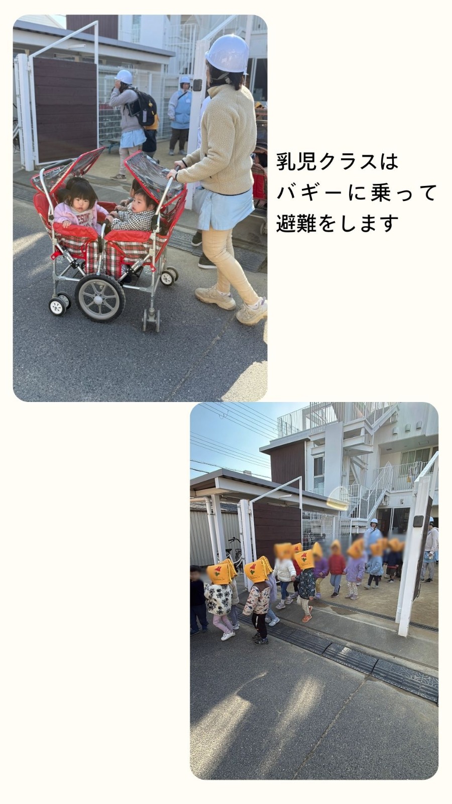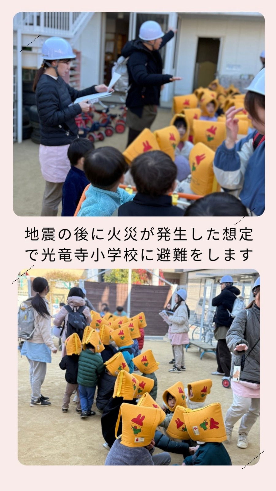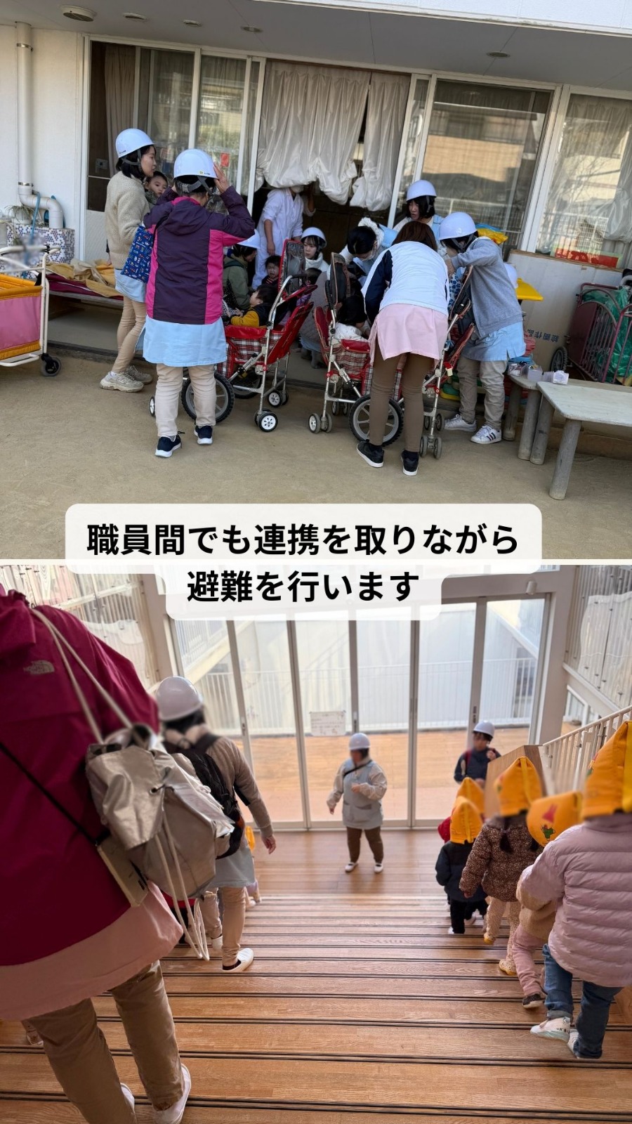 2月4日(水)広域避難訓練がありました。地震が起きて、その後火災が起きたという想定で近くの小学校まで避難をしました。職員間で連携を取り子、どもが安全に避難することが出来るように振り返りも行いました。 保育園の様子はこちら(インスタグラム)でご覧ください。