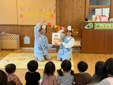 誕生会があり、みんなで誕生児をお祝いしました🎂 一つ大きくなったことを喜び、インタビューに答えてくれましたよ🎤2〜5歳児は歌や・合奏を披露してくれ、保育者からはスケッチブックシアターのプレゼントでした✨ 試食会では保護者と一緒で嬉しそうに食べる姿が見られました★ 今日の様子はインスタグラムからもご覧いただけます。