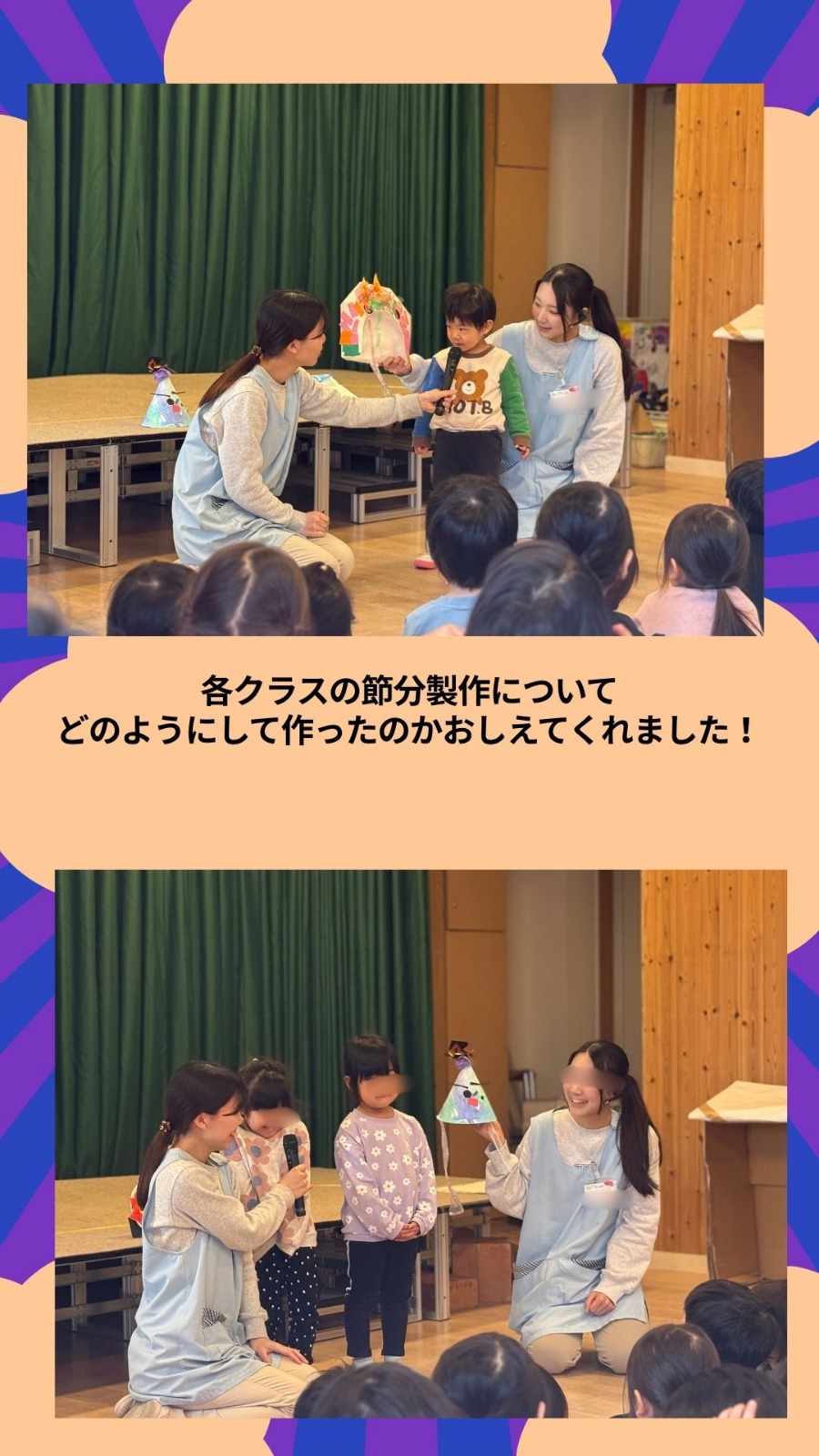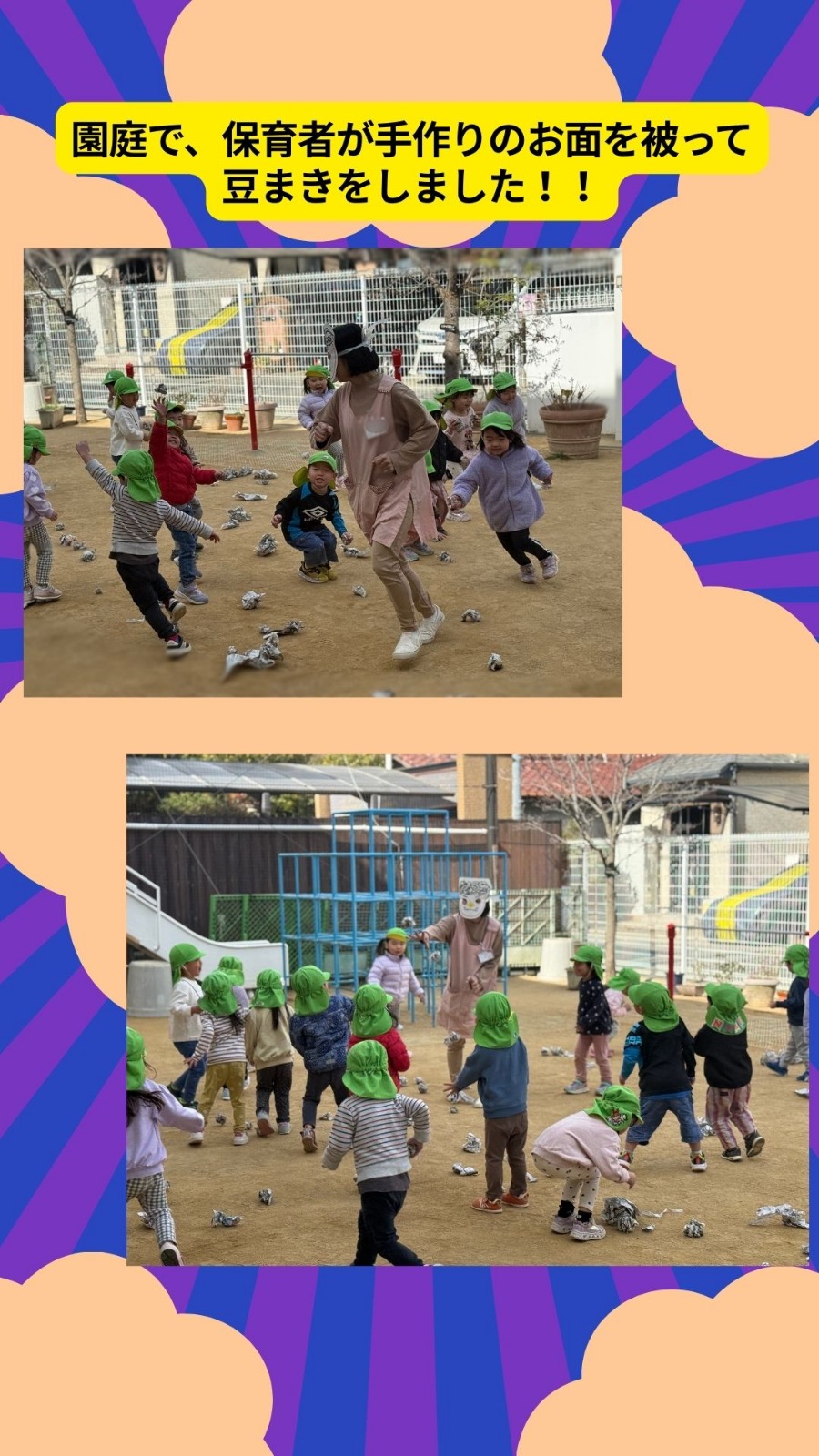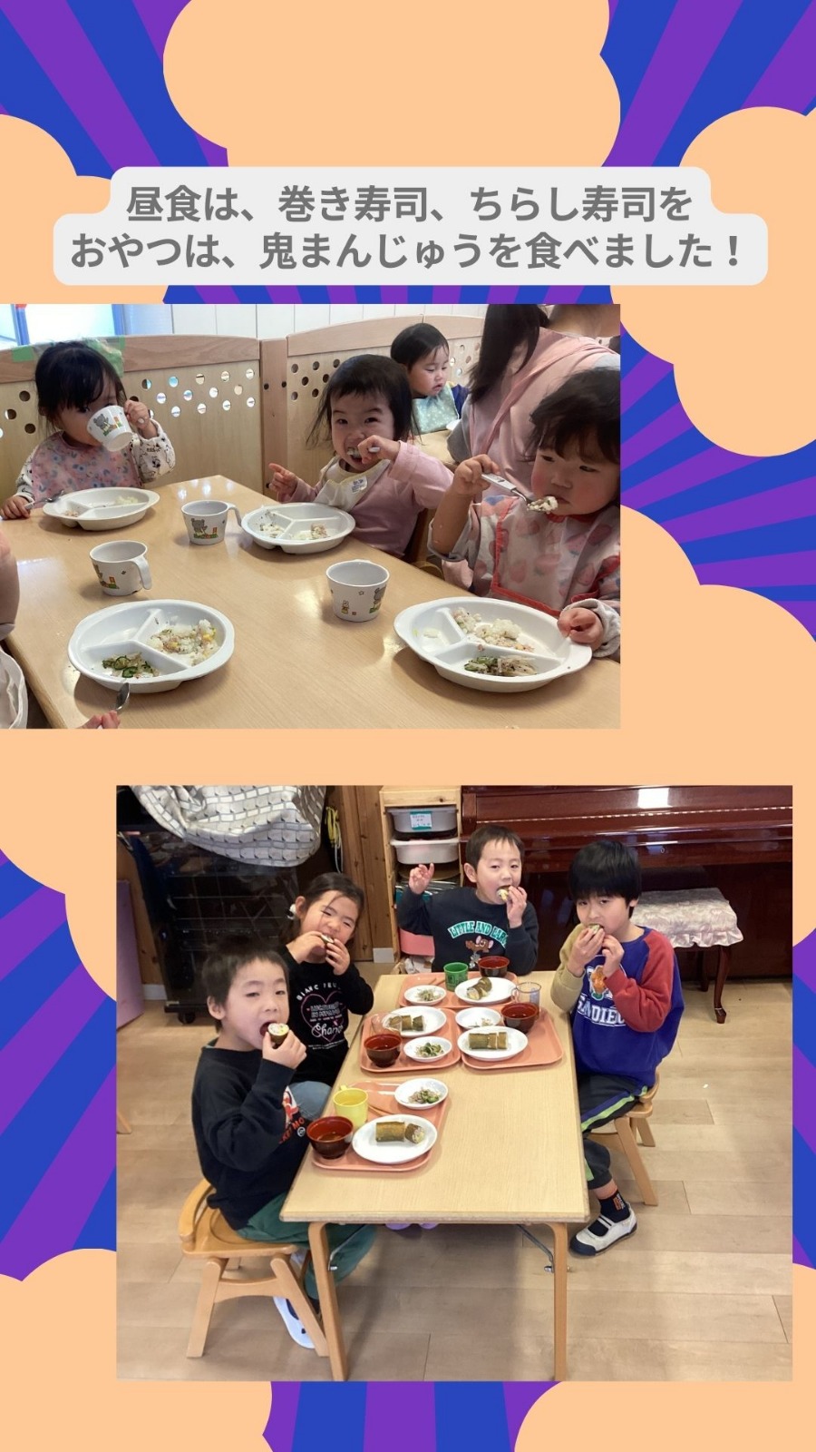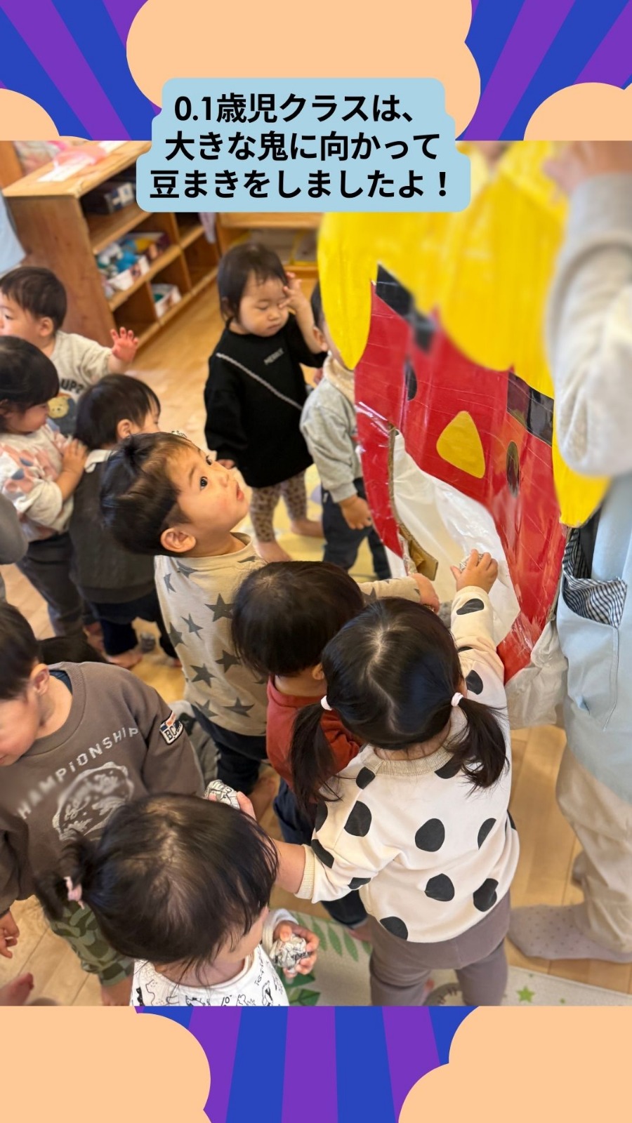 2月3日(火)節分の日の集いがありました。0.1歳児クラス、2.3.4.5歳児クラスの2部制で行いました。節分の由来を聞いたり、歌を歌ったりしました★ 保育園の様子はこちら(インスタグラム)でご覧ください。