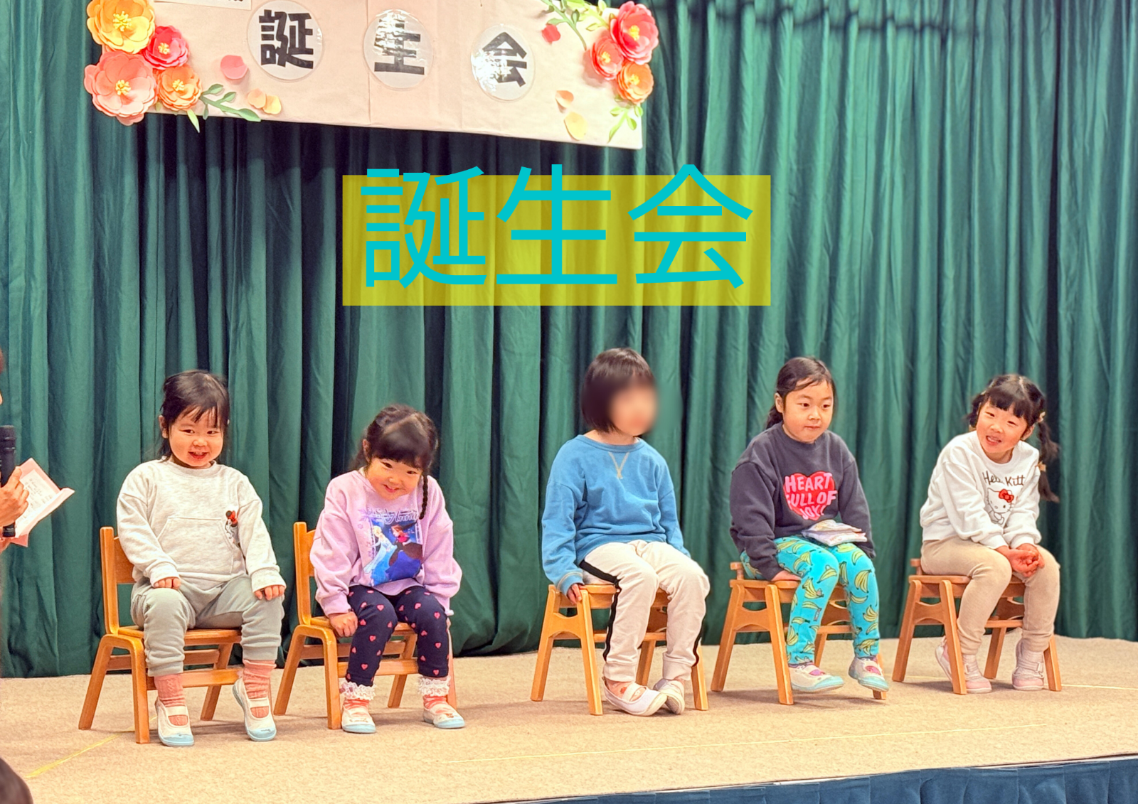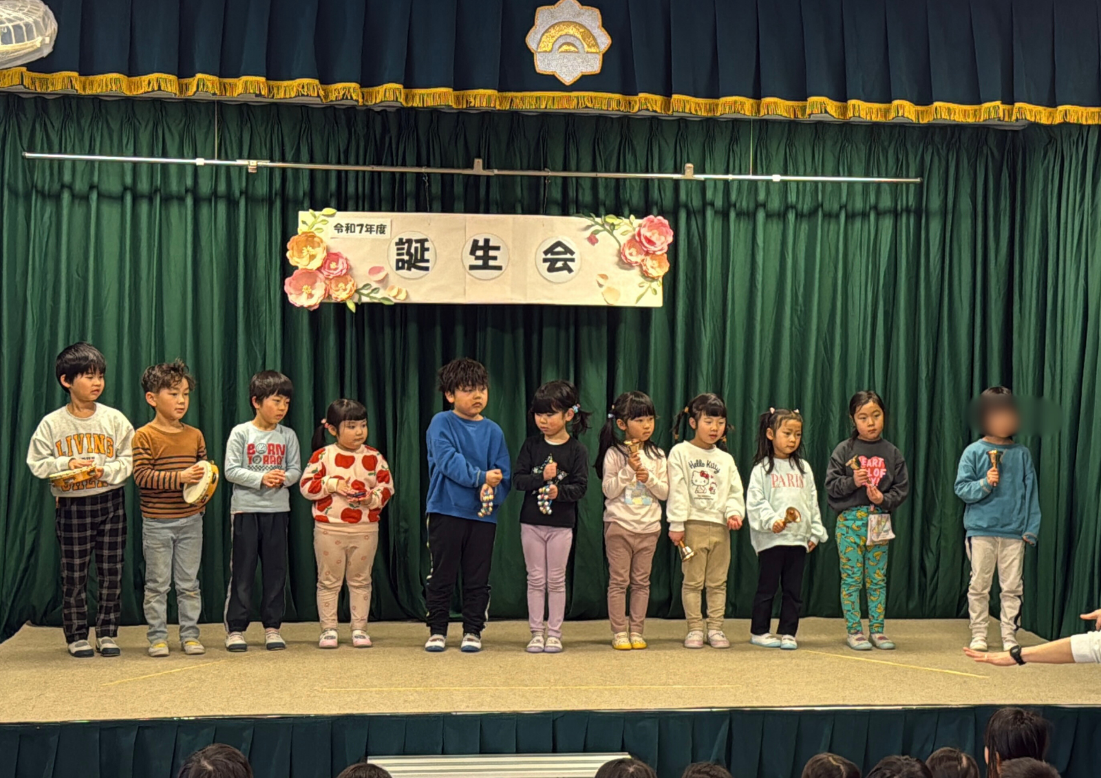1月15日(木)1月の誕生会がありました★誕生児は舞台に上がると嬉しそうに手を振ったりインタビューでは好きな食べ物などを恥ずかしそうに答えていました。保育者や園児からハンドベルの演奏のプレゼントや歌のプレゼントがありました✨栄養士からは保護者の方にレシピ紹介をしてもらいました。 保育園の様子はこちら(インスタグラム)でご覧ください。