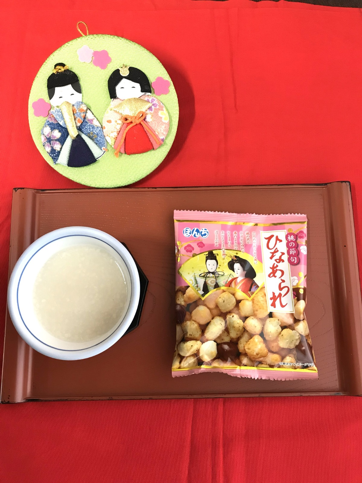 春の節句を彩る本日の昼食メニュー☆彡・桜ちらし・金時豆の煮物・みかん・赤だし本日のおやつ☆彡・甘酒・ひなあられ華やかな春を感じる【桜ちらし寿司】や、可愛らしい【ひなあられ】を召し上がられ笑顔あふれるひとときでした✨
