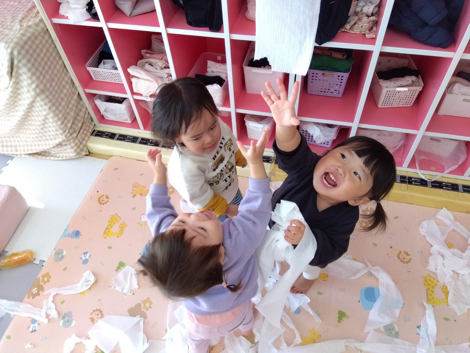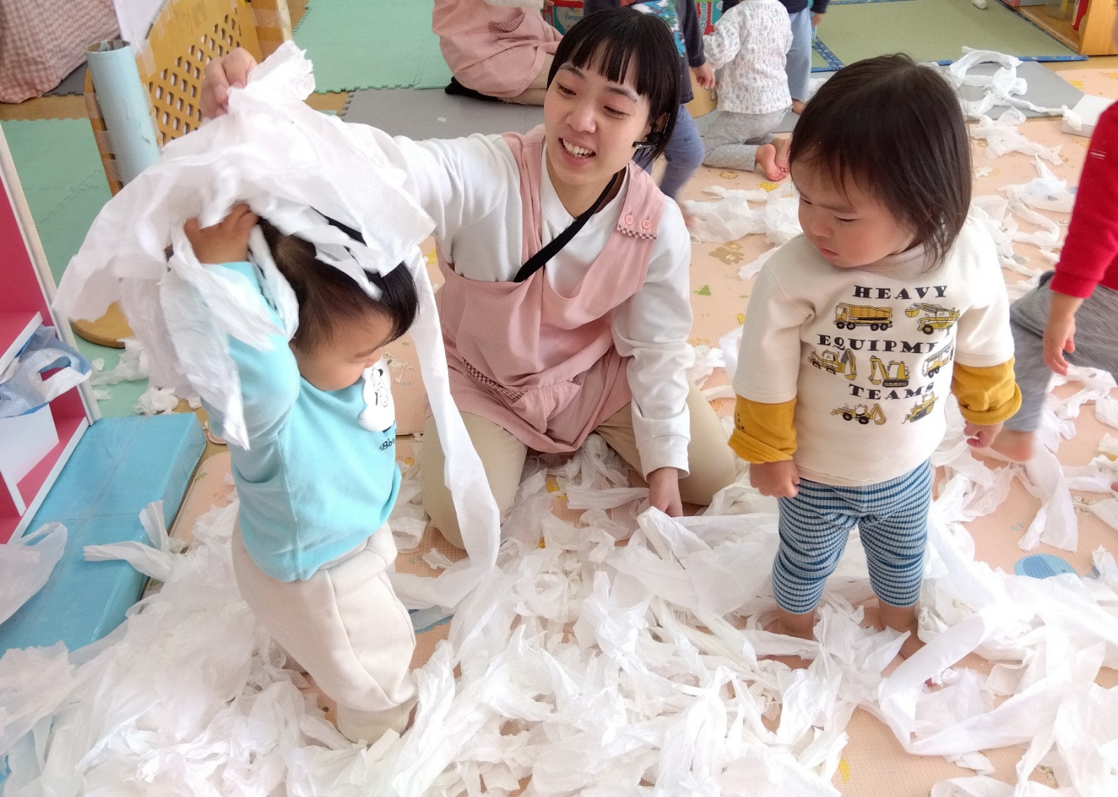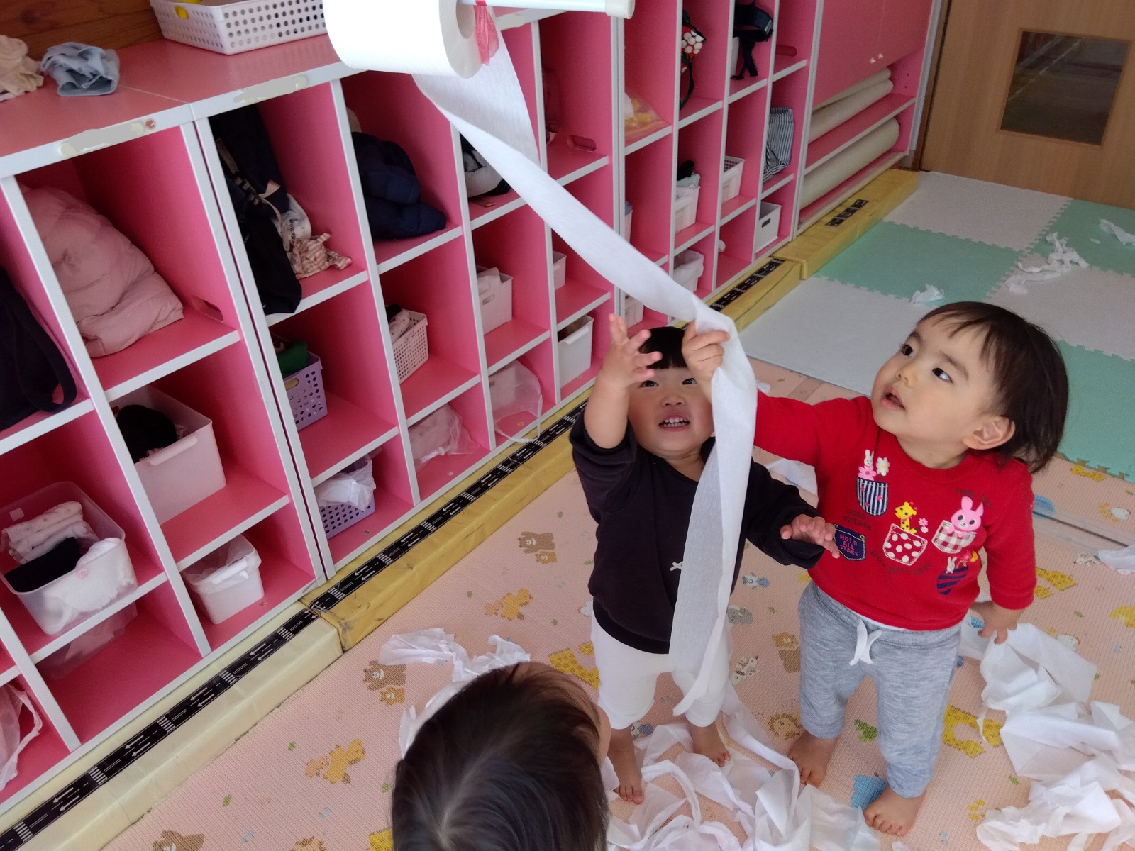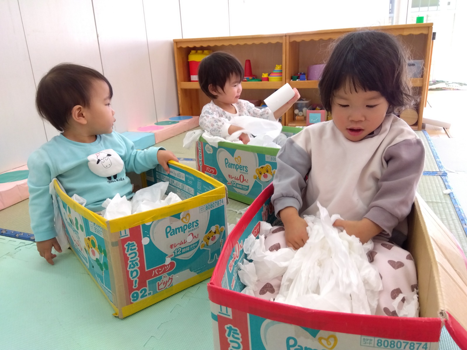 1歳児クラスでトイレットペーパーで遊びました。ロールから最後まで引っ張り出したり容器に入れたりとダイナミックに遊んでいました!