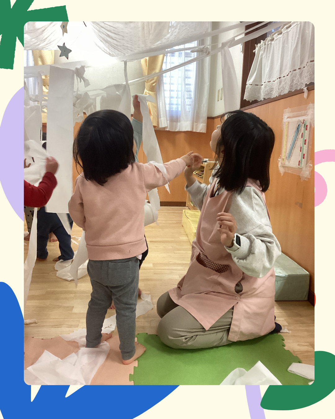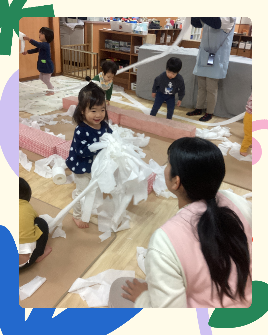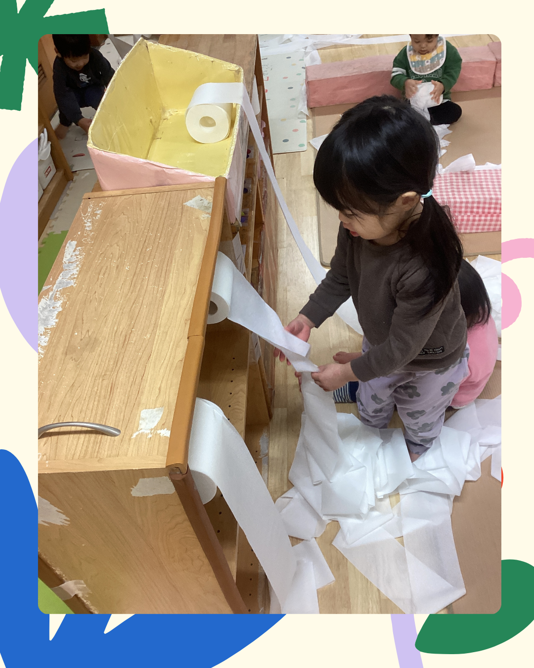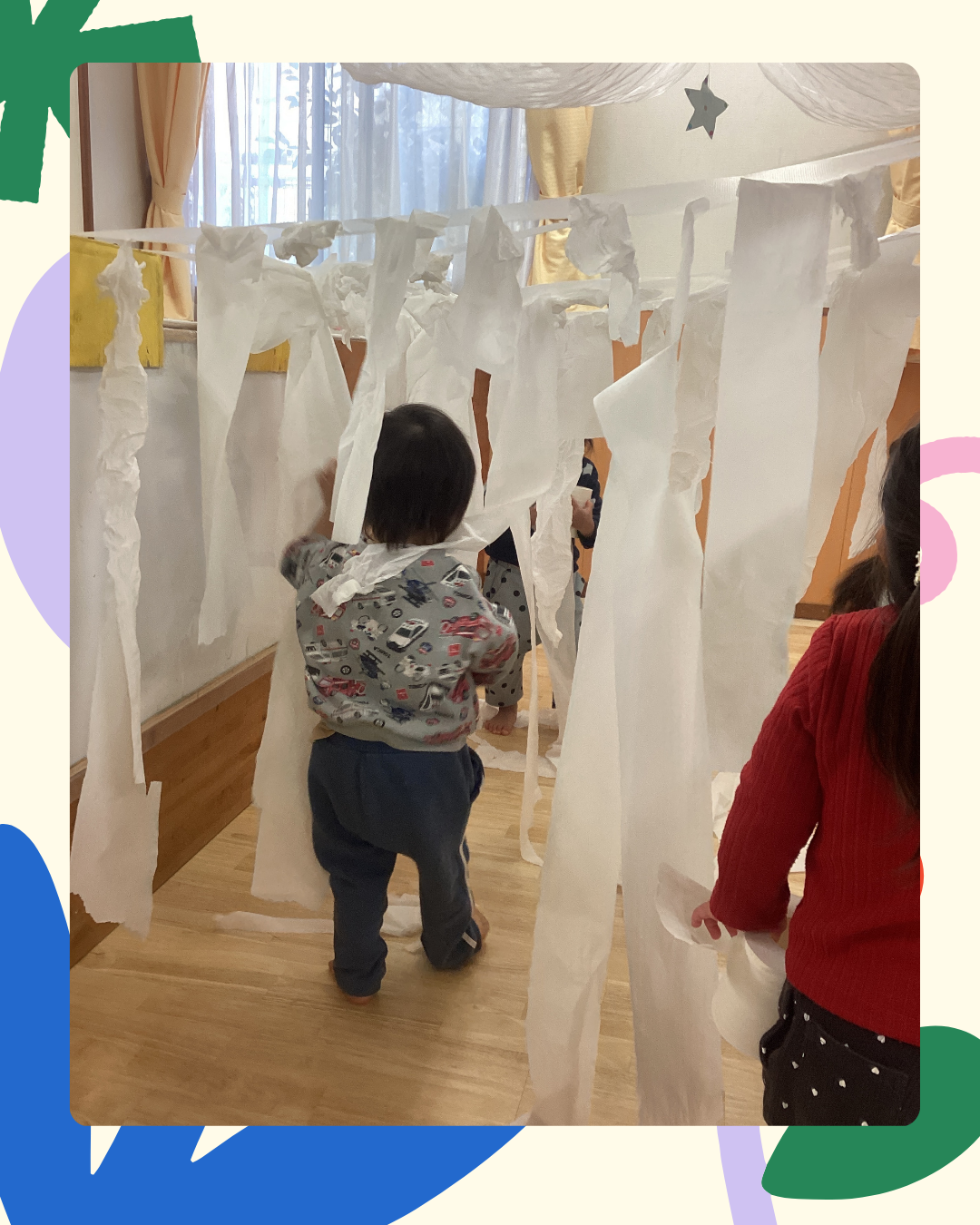1月9日(金)今日は公開保育を行いました。トイレットペーパーの素材を使い、ひっぱったり…ちぎったり…丸めたり…しながら遊びました!また、素材の感触を存分に味わいながら指先や全身を使って楽しむ姿も見られましたよ。インスタにも載せていますのでごらんください。インスタグラムはこちらから