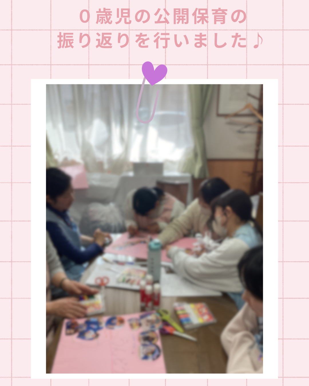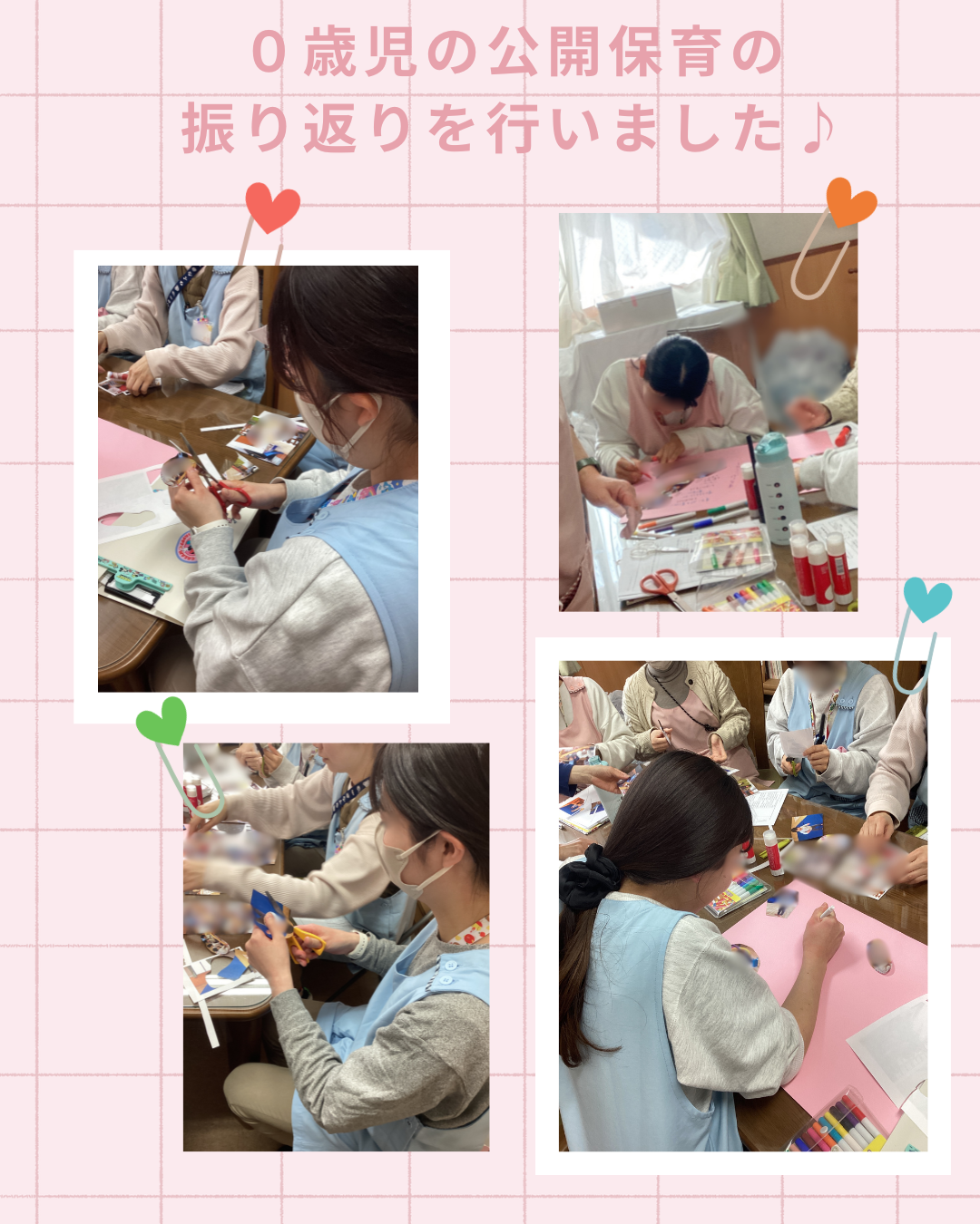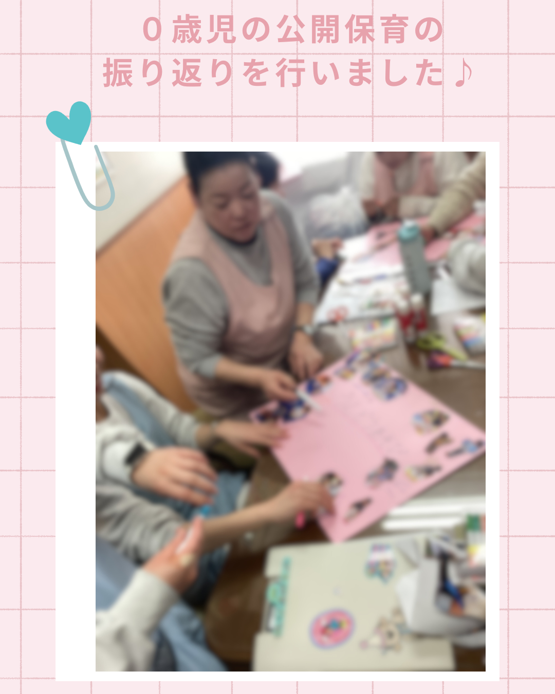 2月5日(木)先日行った0歳児クラスの公開保育の振り返りを行いました!みんなで子どもの育ちについて話し合いながらドキュメンテーションの作成もしました。インスタにも載せていますのでごらんください。インスタグラムはこちらから