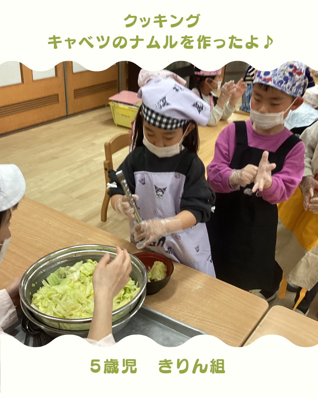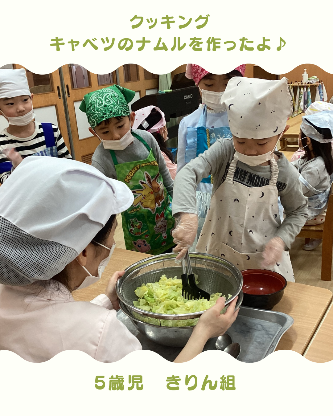 4月10日(金)収穫したキャベツでナムルを作りました。友達と一緒に「これくらいかな?」と話しながら、キャベツに調味料を入れて混ぜていましたよ♪できあがったナムルは昼食時にみんなで美味しく食べました!「おいしい~!」と喜んで食べていました。インスタにも載せていますのでごらんください。インスタグラムはこちらから