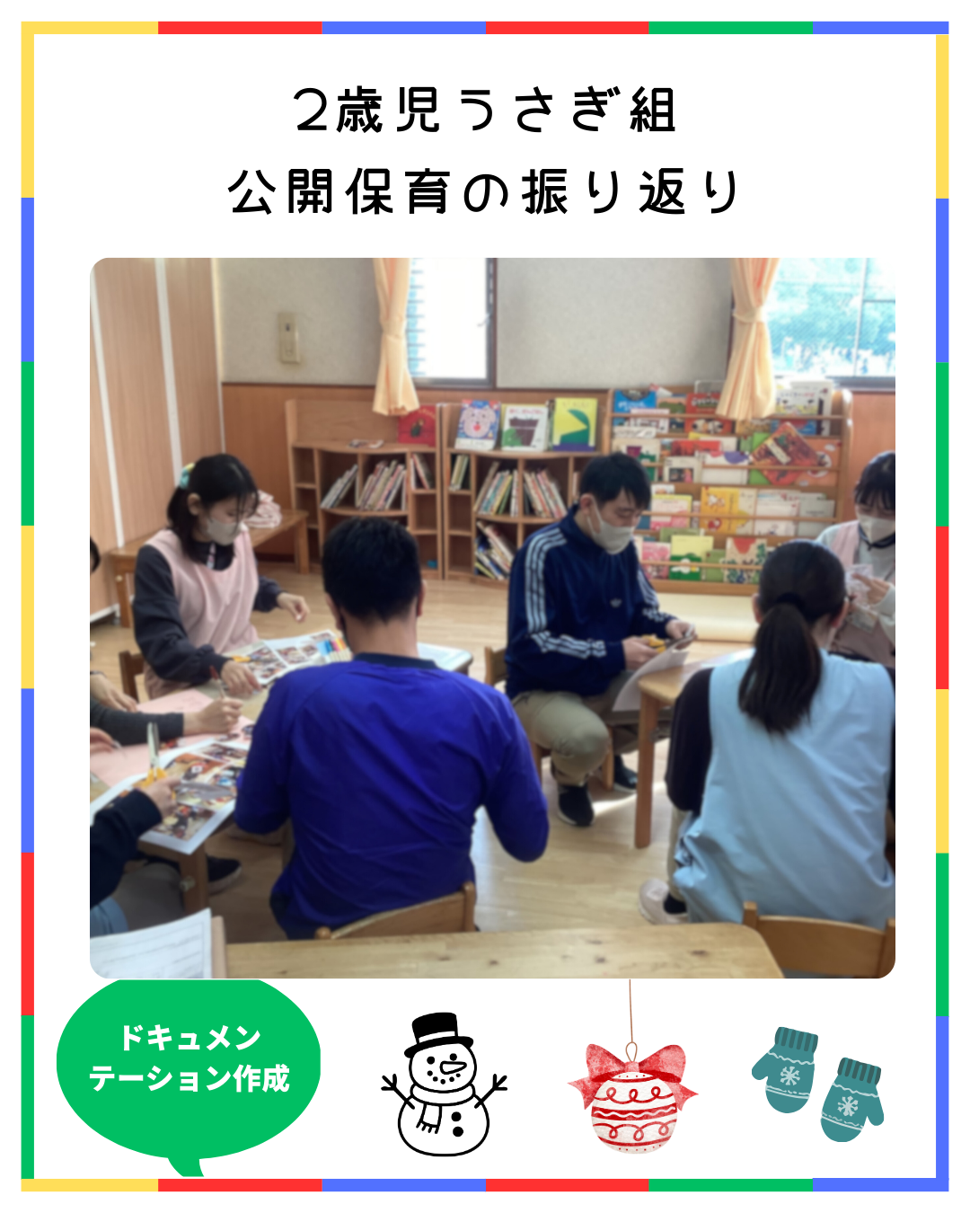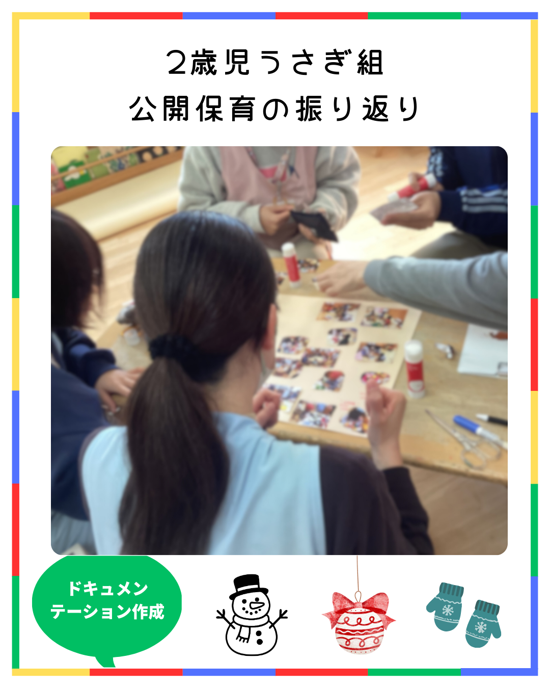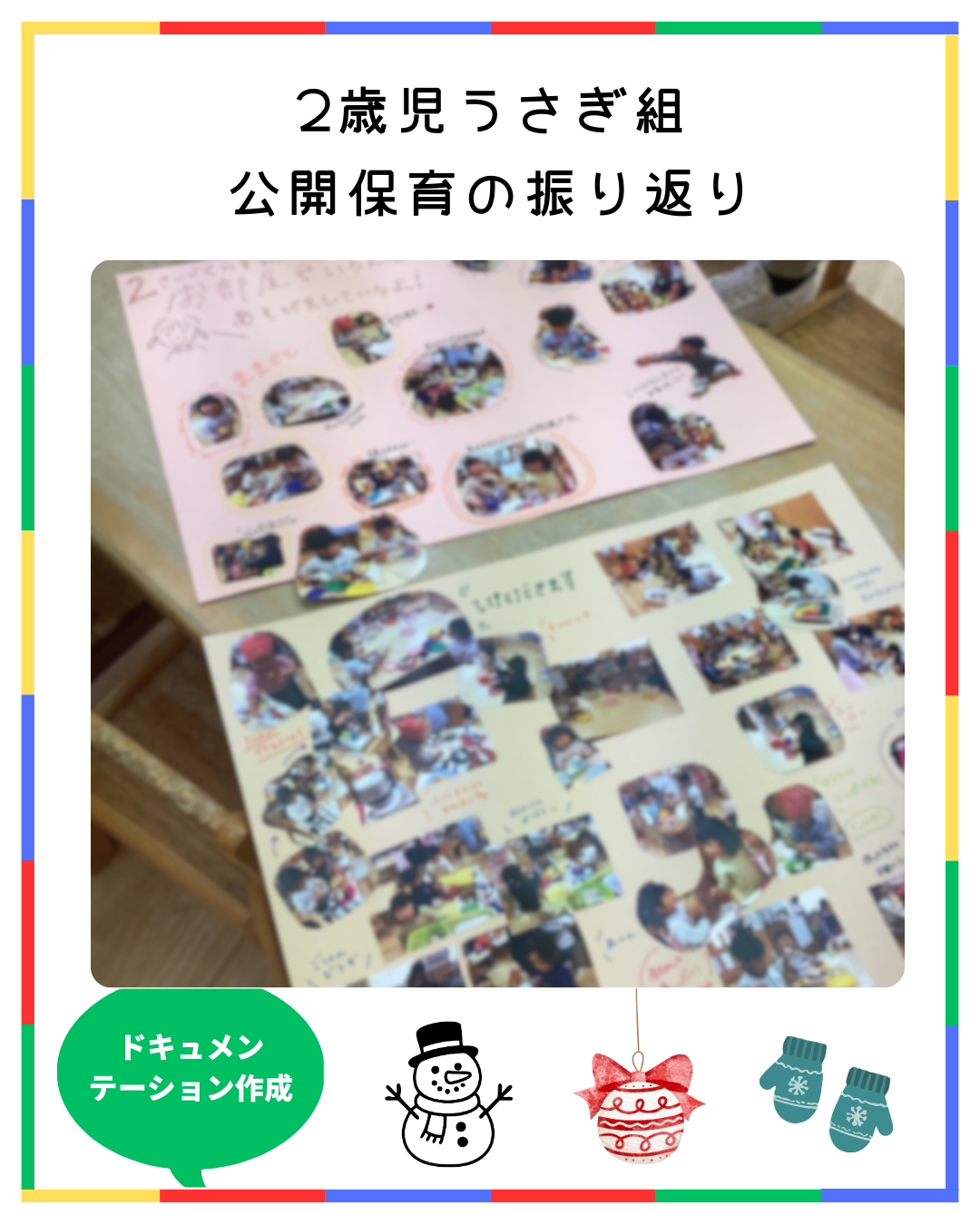 12月10日(水)今日は2歳児うさぎ組の公開保育の振り返りを行いました!公開保育で撮影した子どもの写真を持ち寄り、子どもの様子や育ちなどを職員間で意見交換しながらドキュメンテーションを作成しました。インスタにも載せていますのでごらんください。インスタグラムはこちらから