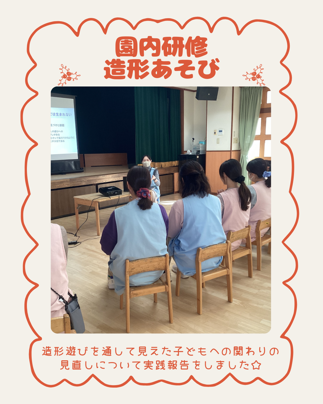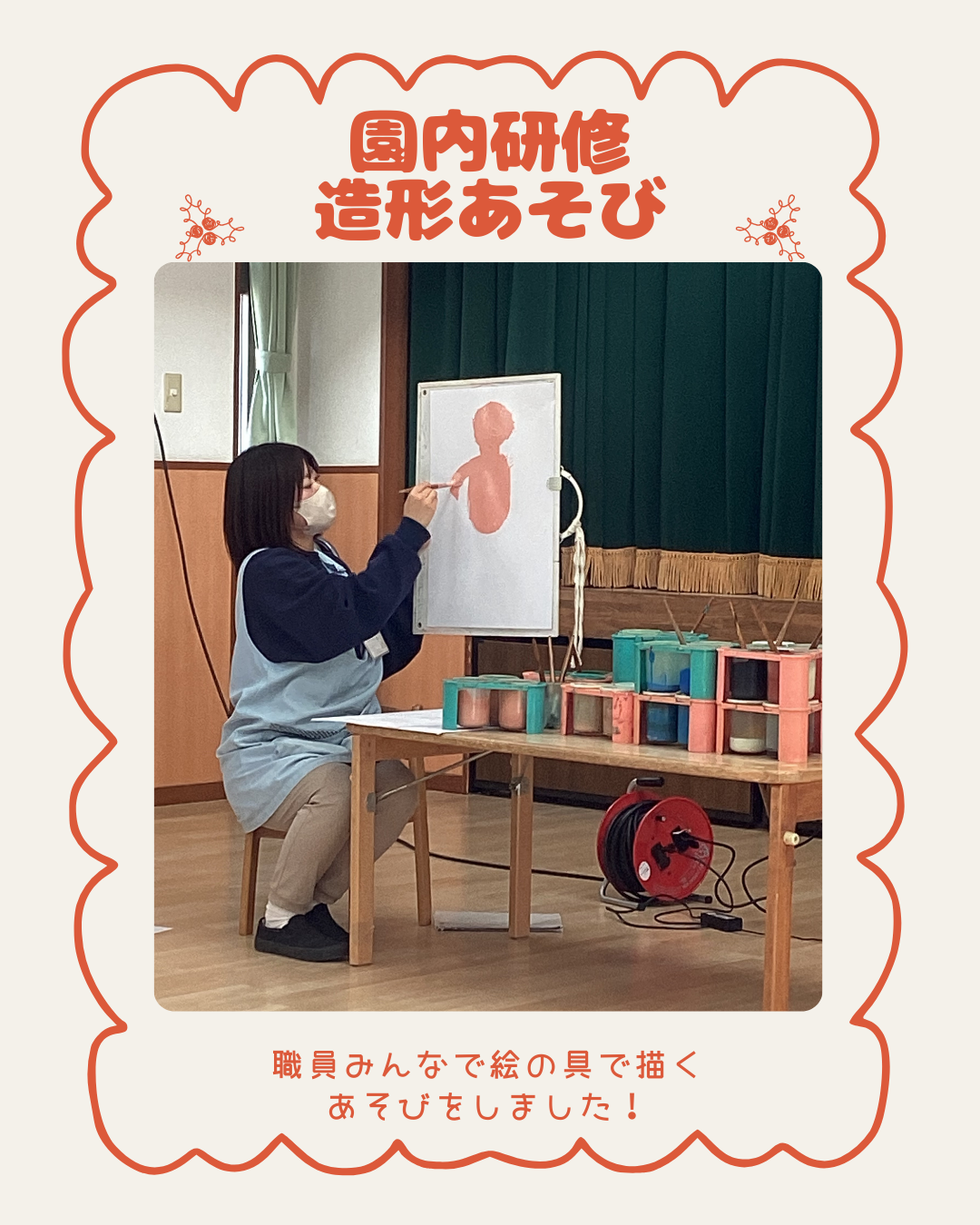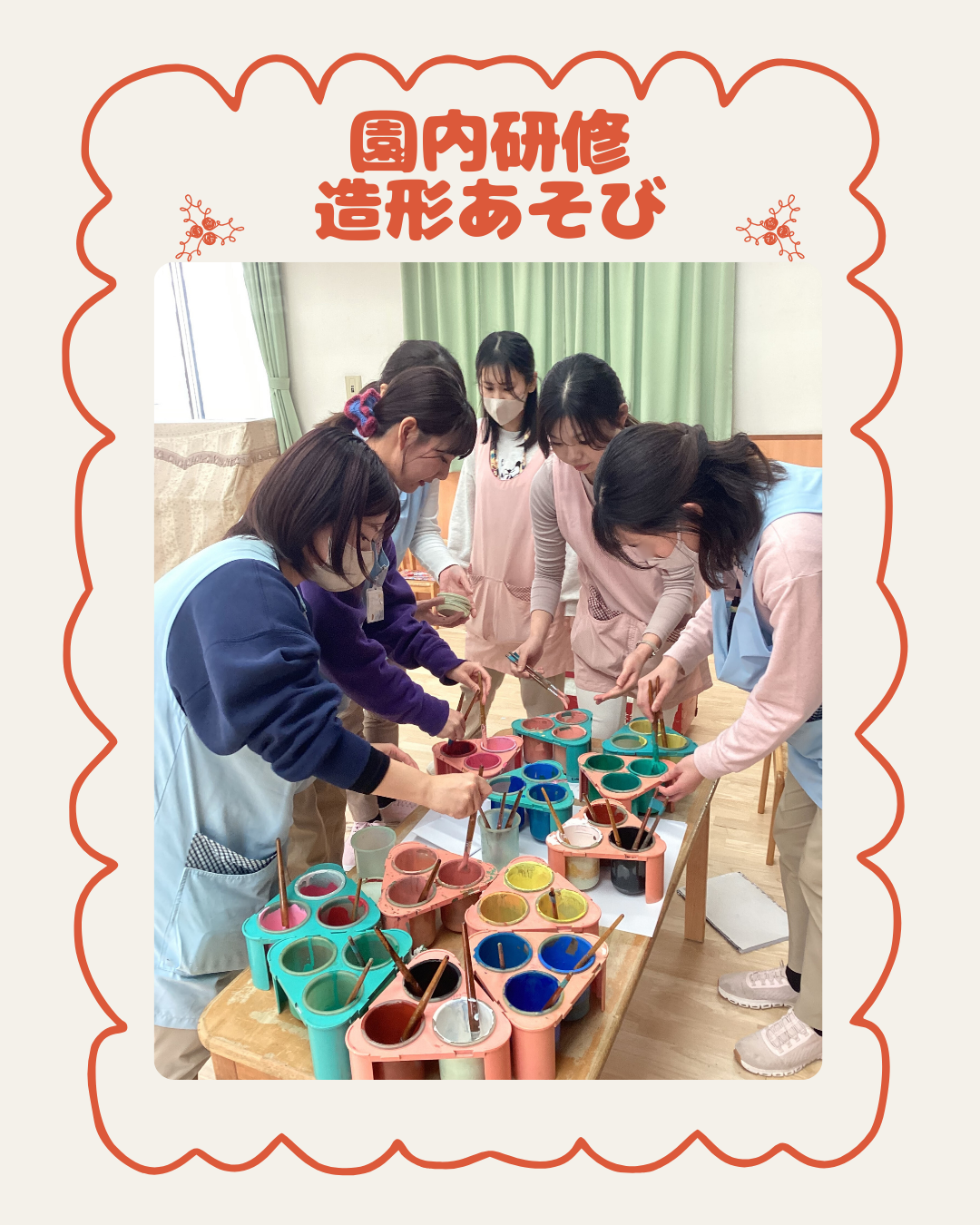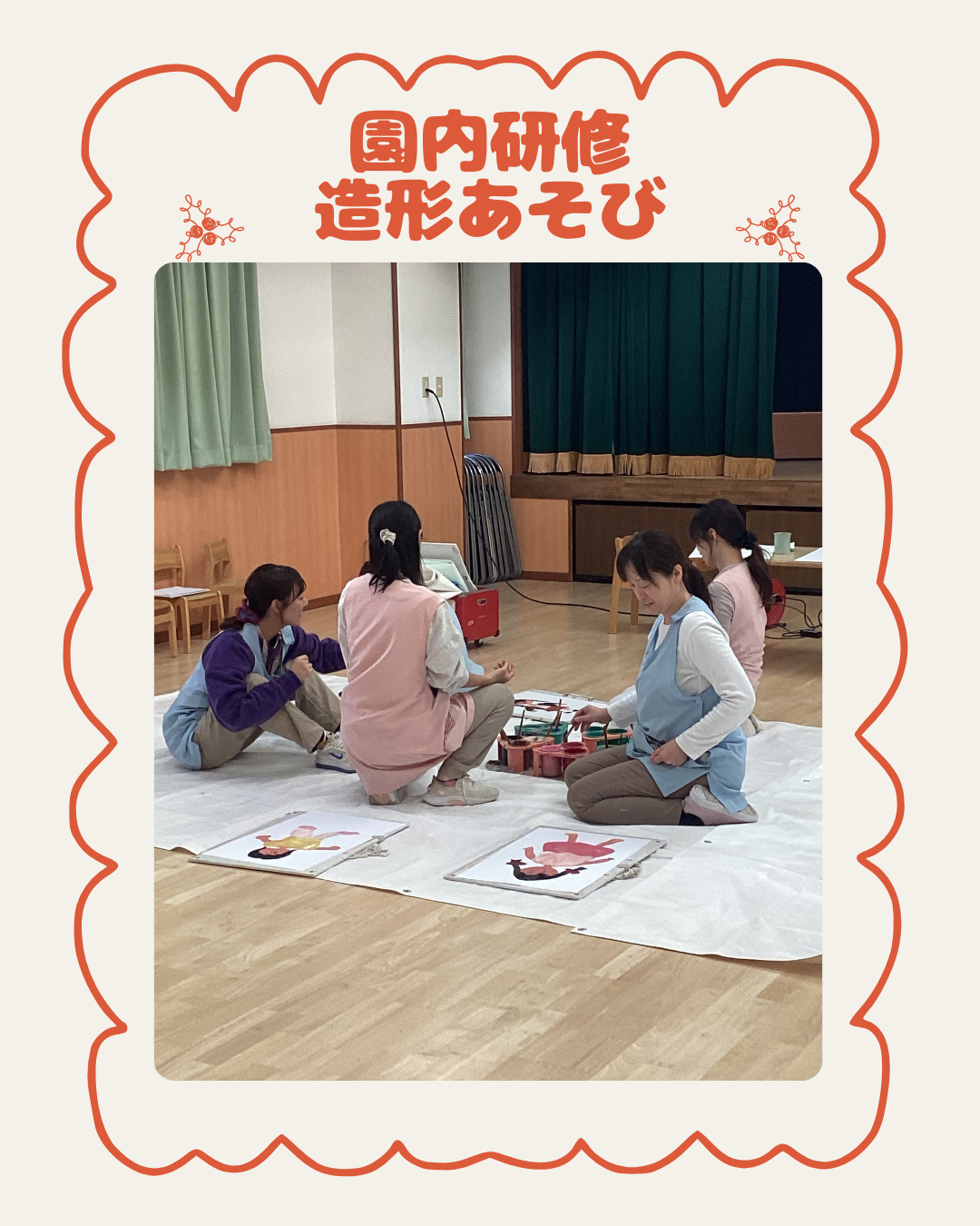 12月19日(金)先日、準備をしていた絵の具を使って造形遊びの園内研修を行いました。第75回の造形表現・図画工作・美術教育研究全国大会の実践発表をした内容を改めて職員のみんなに伝え、その後に絵の具の溶き具合や配置なども確認しながら、職員が描く楽しさを味わえるような題材を選び進めました。職員みんな「絵の具はやっぱり楽しい!」「子ども達と一緒に描きたい!」といった声が聞かれました。インスタにも載せていますのでごらんください。インスタグラムはこちらから