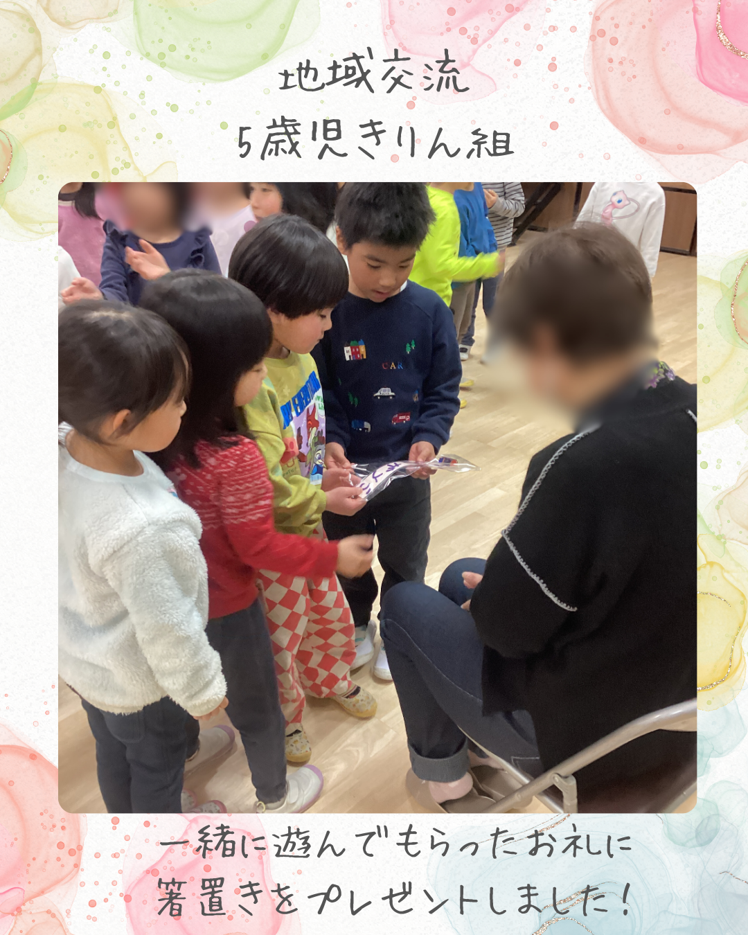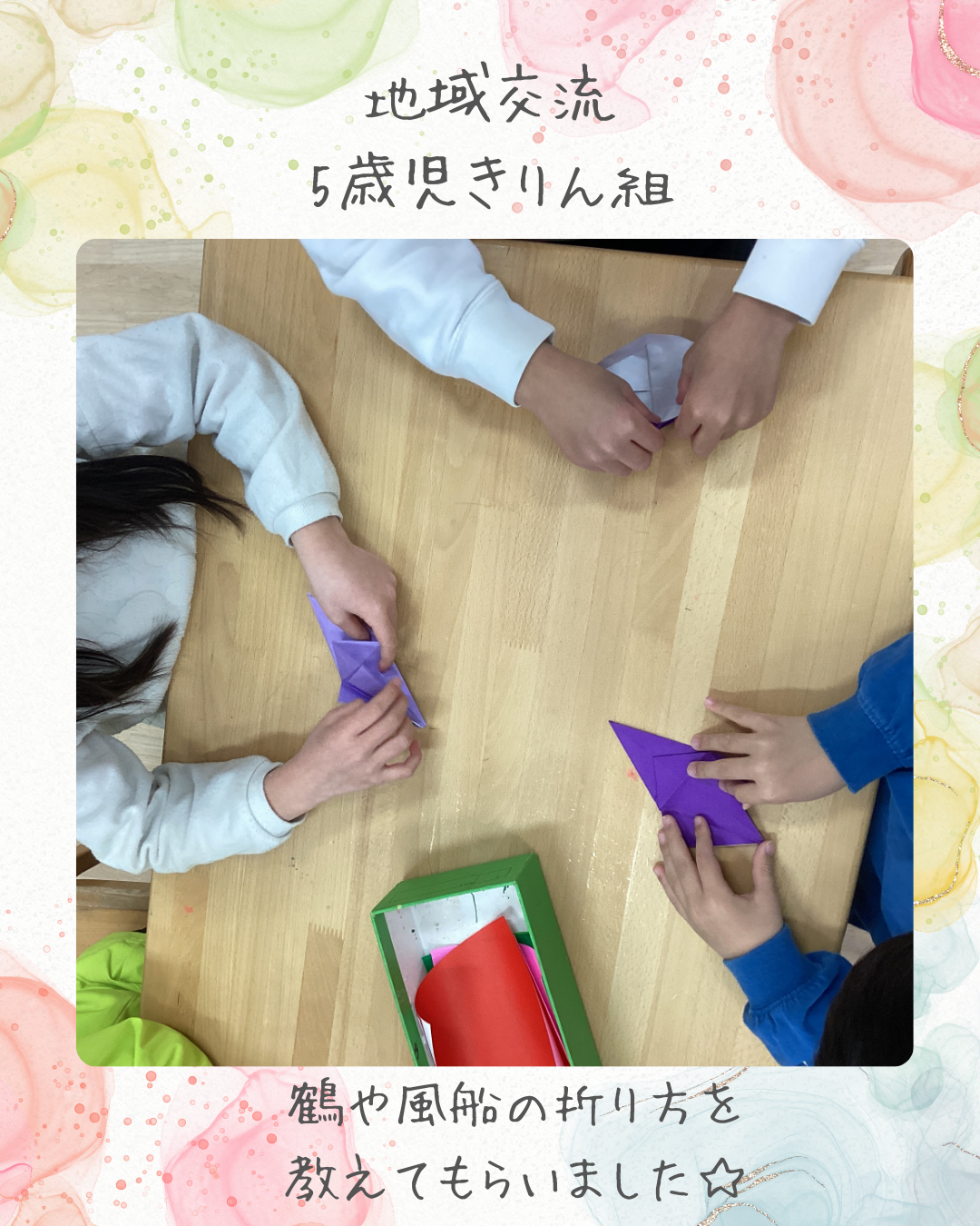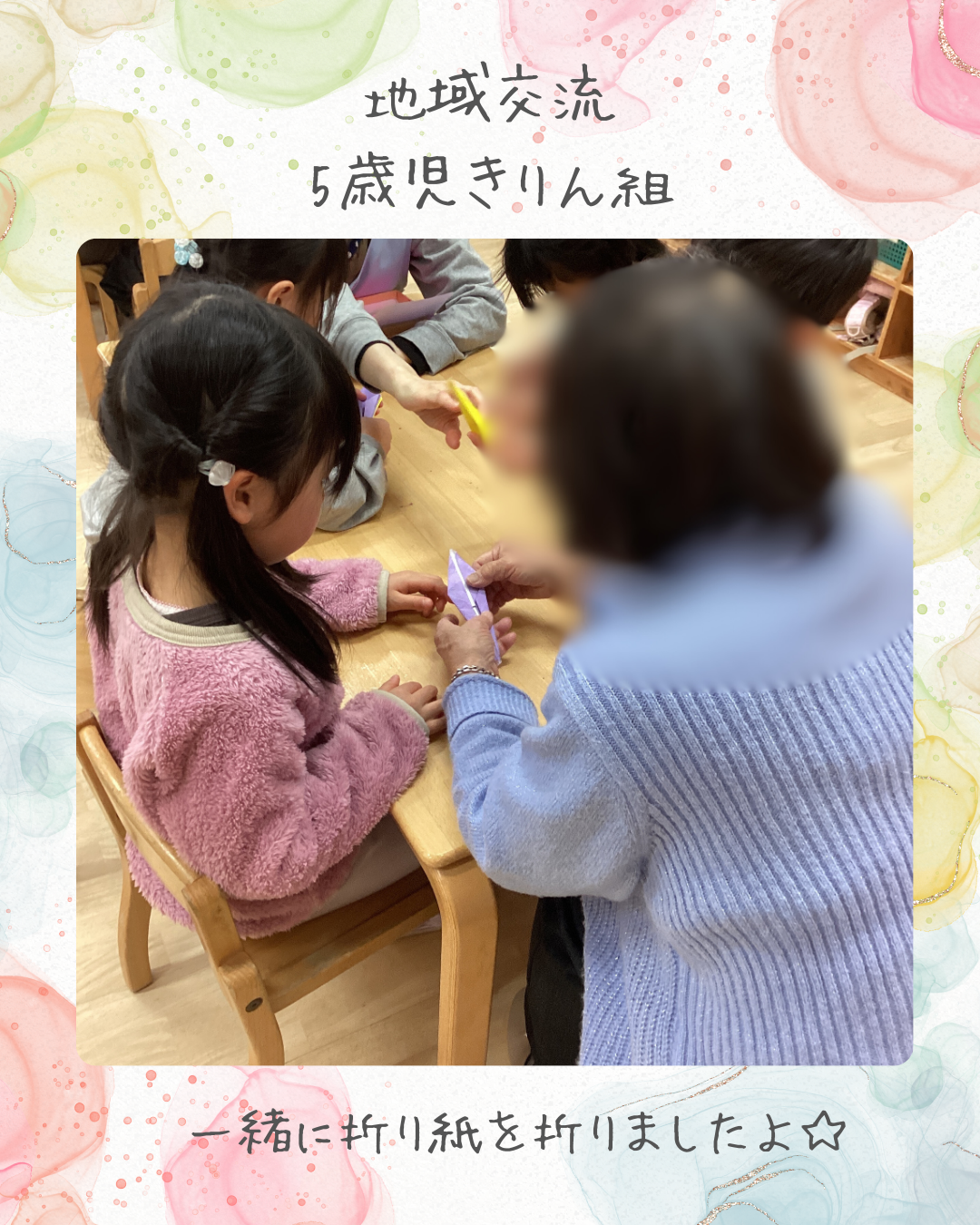 2月10日(火)今日はいつも地域のいきいきサロンでお世話になっている方が保育園に足を運んでくださり、5歳児きりん組の子ども達と一緒に交流をしました!折り紙で鶴や風船の折り方を教えてもらったり、歌のプレゼントをしながら楽しい時間を過ごさせていただきました。また、これからもよろしくお願いします♪インスタにも載せていますのでごらんください。インスタグラムはこちらから