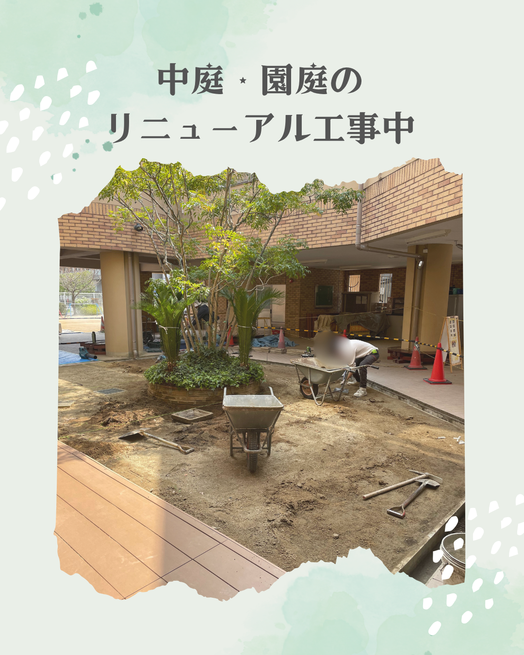 3月30日(月)中庭&園庭のリニューアル工事が進んでいます!中庭には芝を敷いたり、園庭の築山には丸太で囲い砂をのせたり、側溝の蓋も新しくなるなど工事が進む様子を見ている子ども達にも楽しみにしてくれています。 インスタにも載せていますのでごらんください。インスタグラムはこちらから
