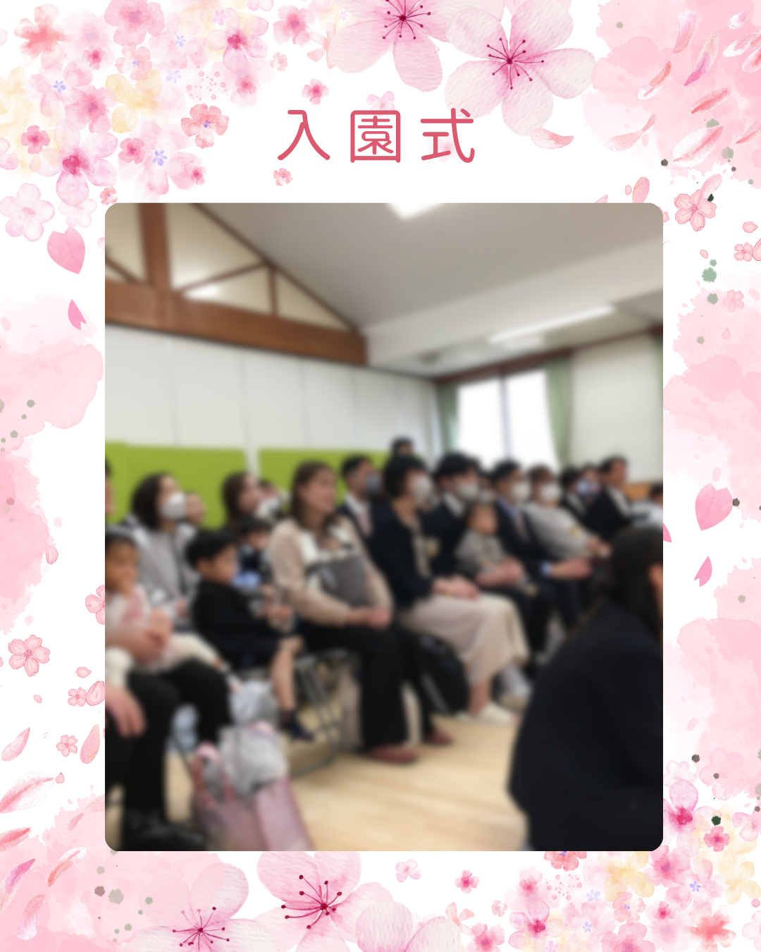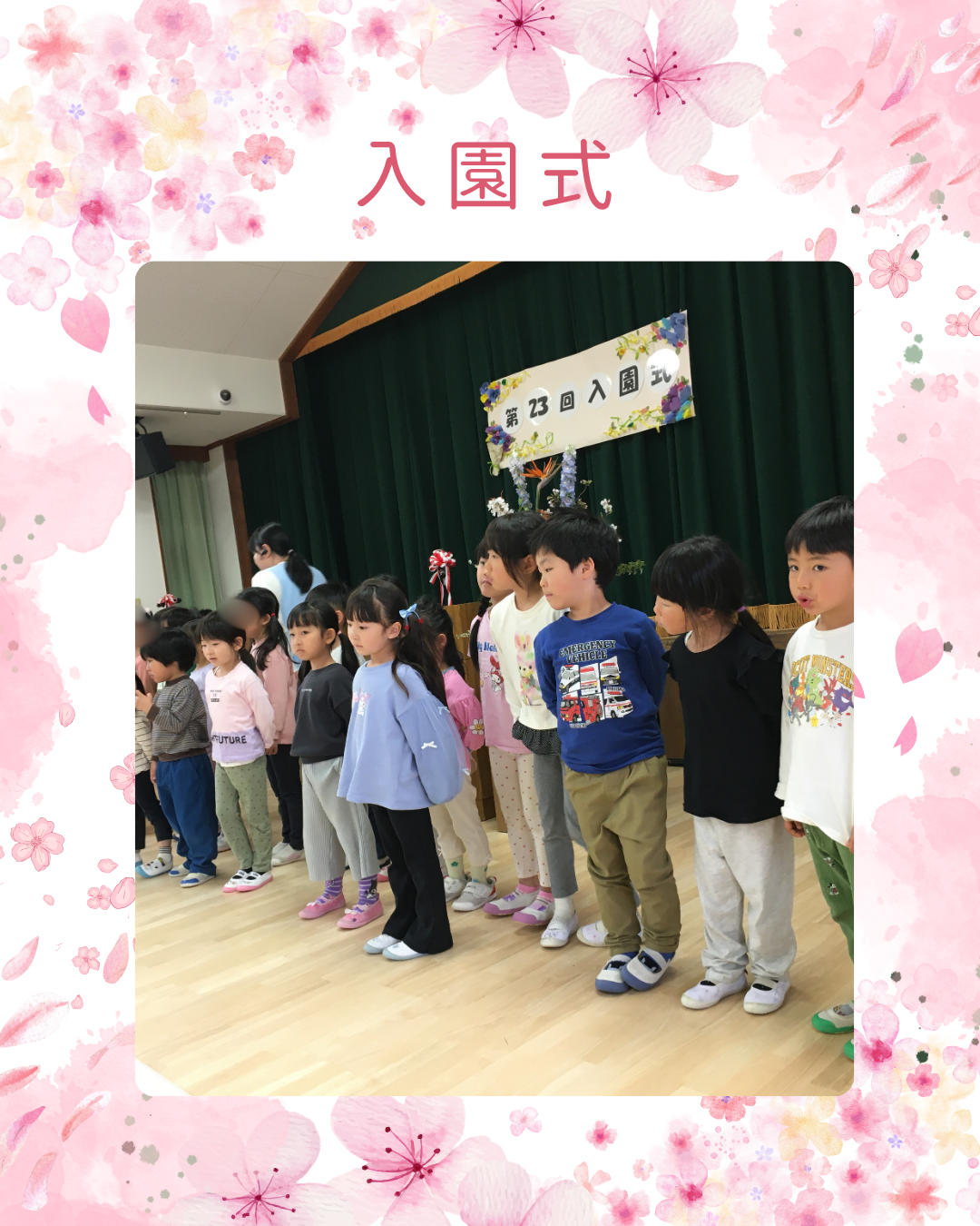 4月1日(水)今日は第23回入園式を行いました。今年度は新しく32名の子ども達が入園します♪式中は名前を呼ばれると保護者の方と一緒に元気に「はーい!」と返事をしたり5歳児きりん組から歌のプレゼントをしたり、和やかな雰囲気の中で進みました。これからよろしくお願いします。 インスタにも載せていますのでごらんください。インスタグラムはこちらから