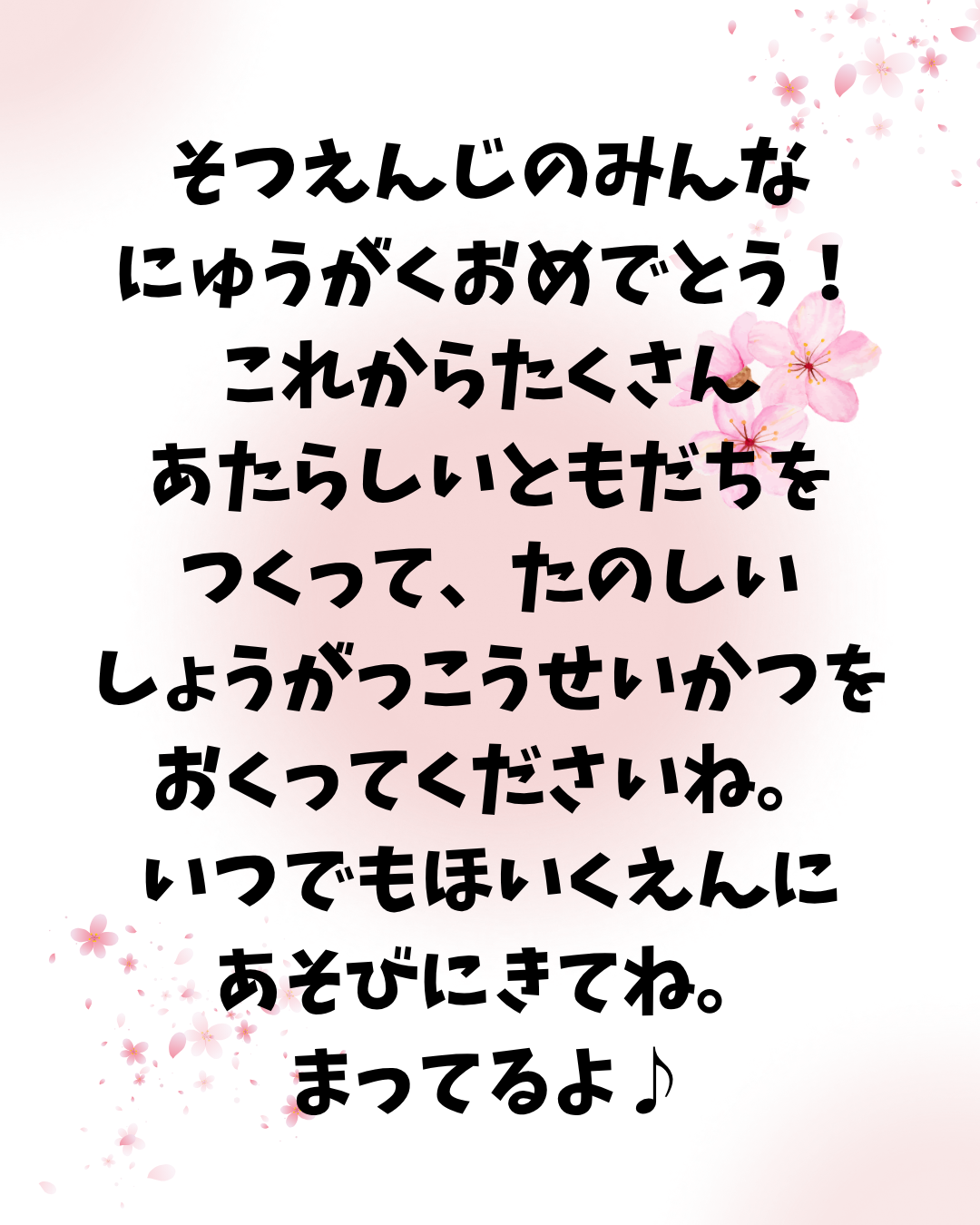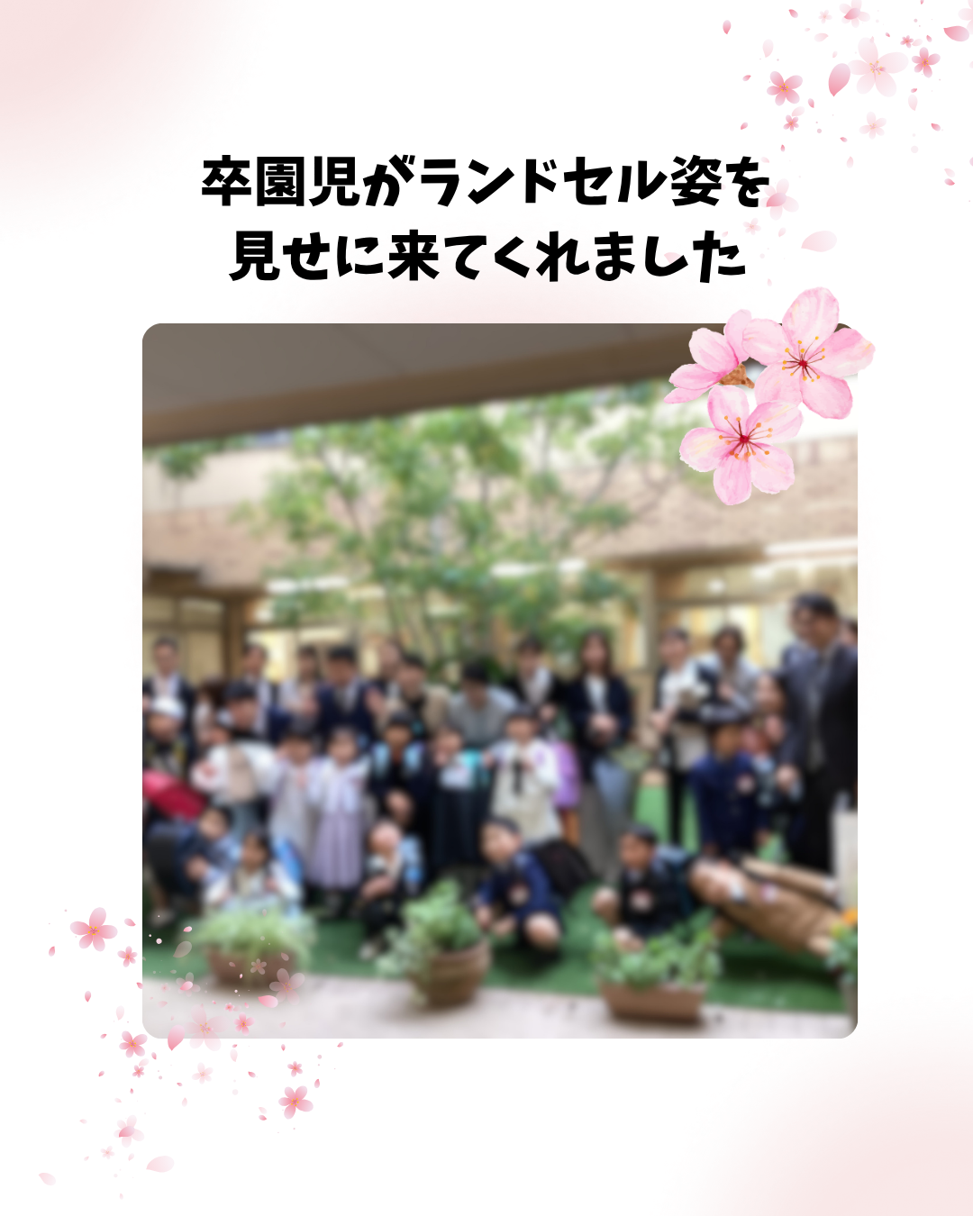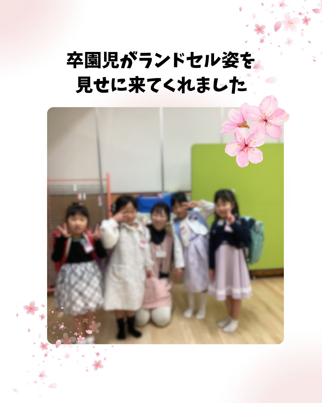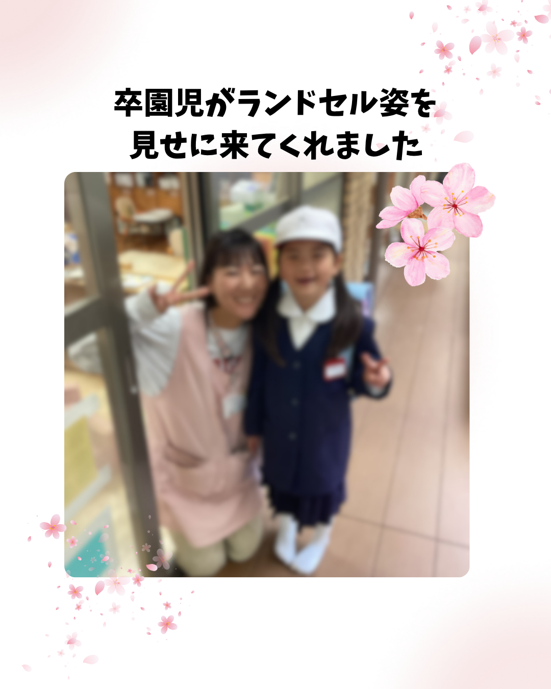 4月7日(火)今日は卒園児が入学式を終えて、ランドセル姿を見せに来てくれました!みんなの顔が生き生きとしていて、これから始まる小学校での生活を楽しみにしているようでした☆また、いつでも遊びに来てくださいね! インスタにも載せていますのでごらんください。インスタグラムはこちらから