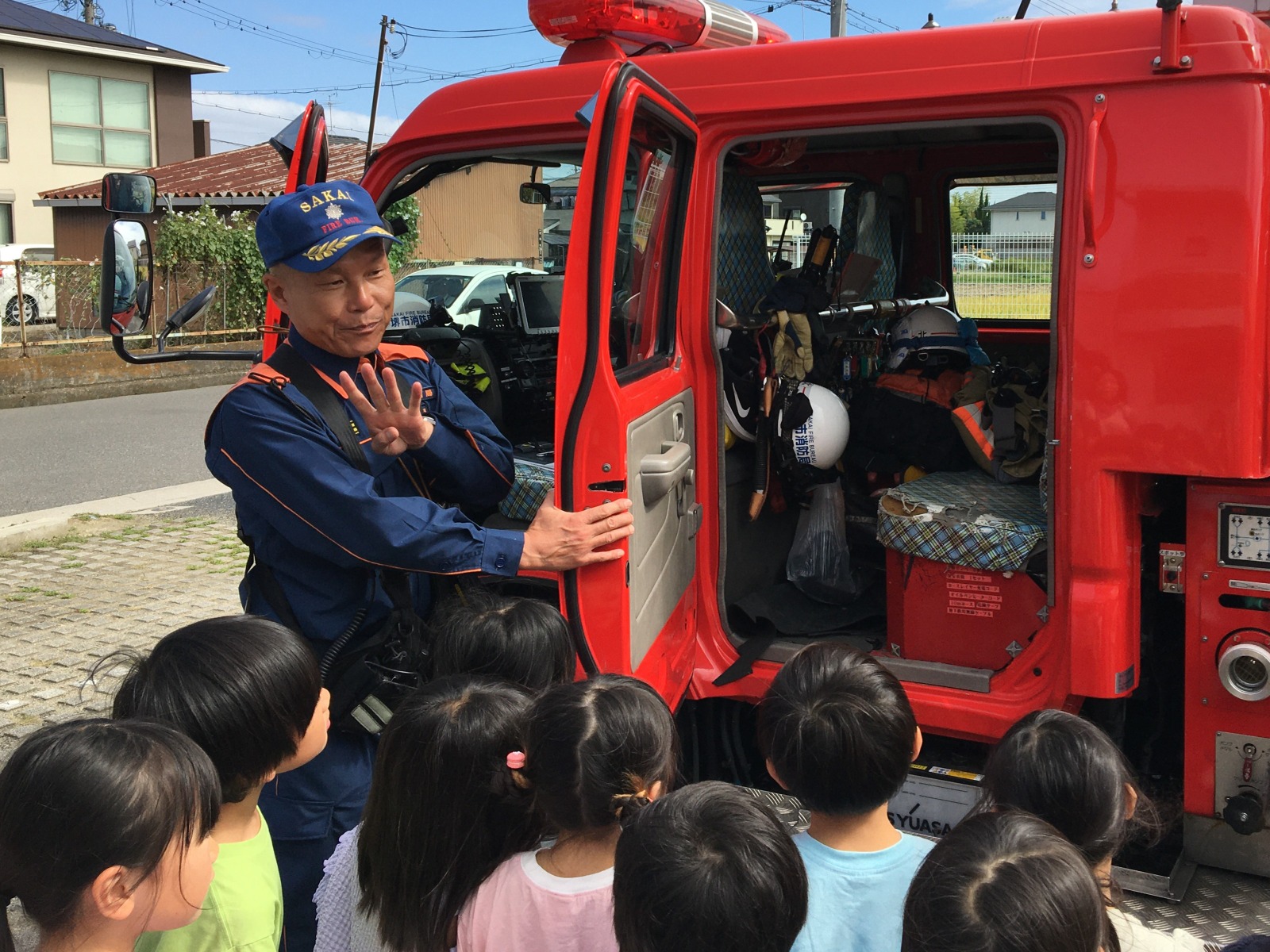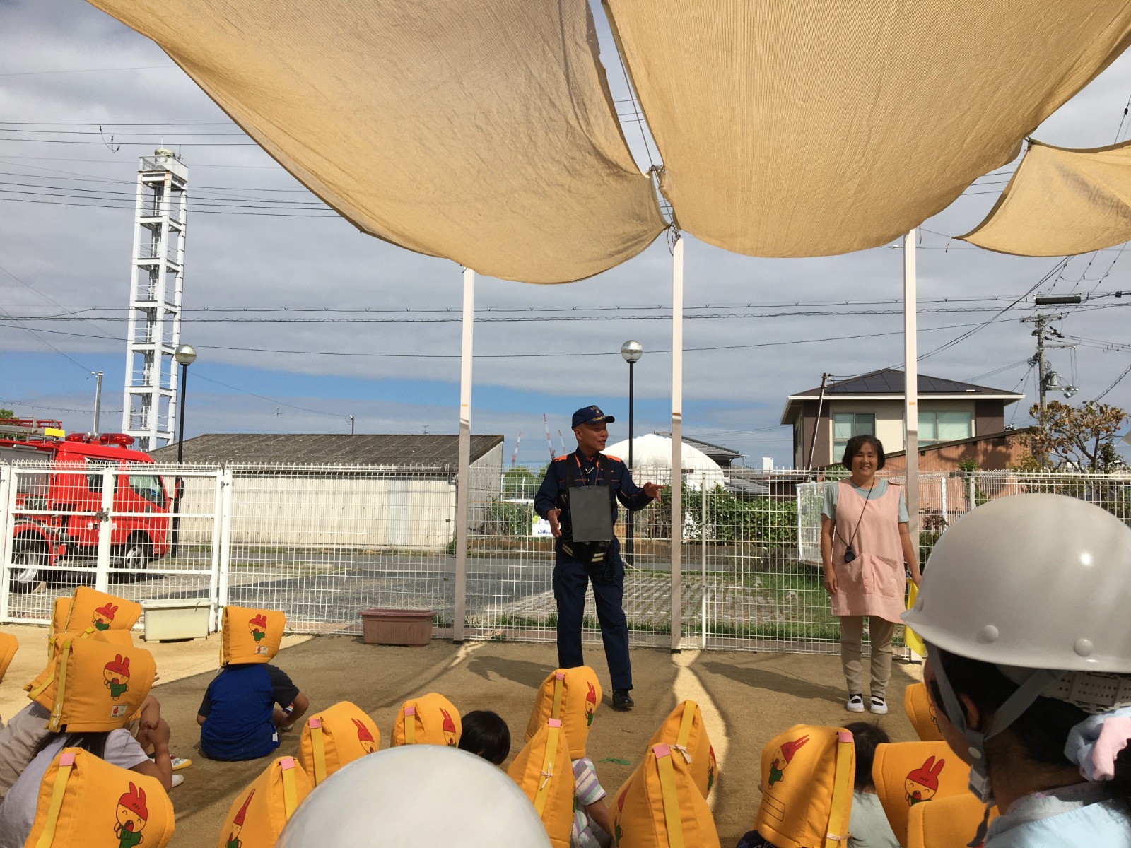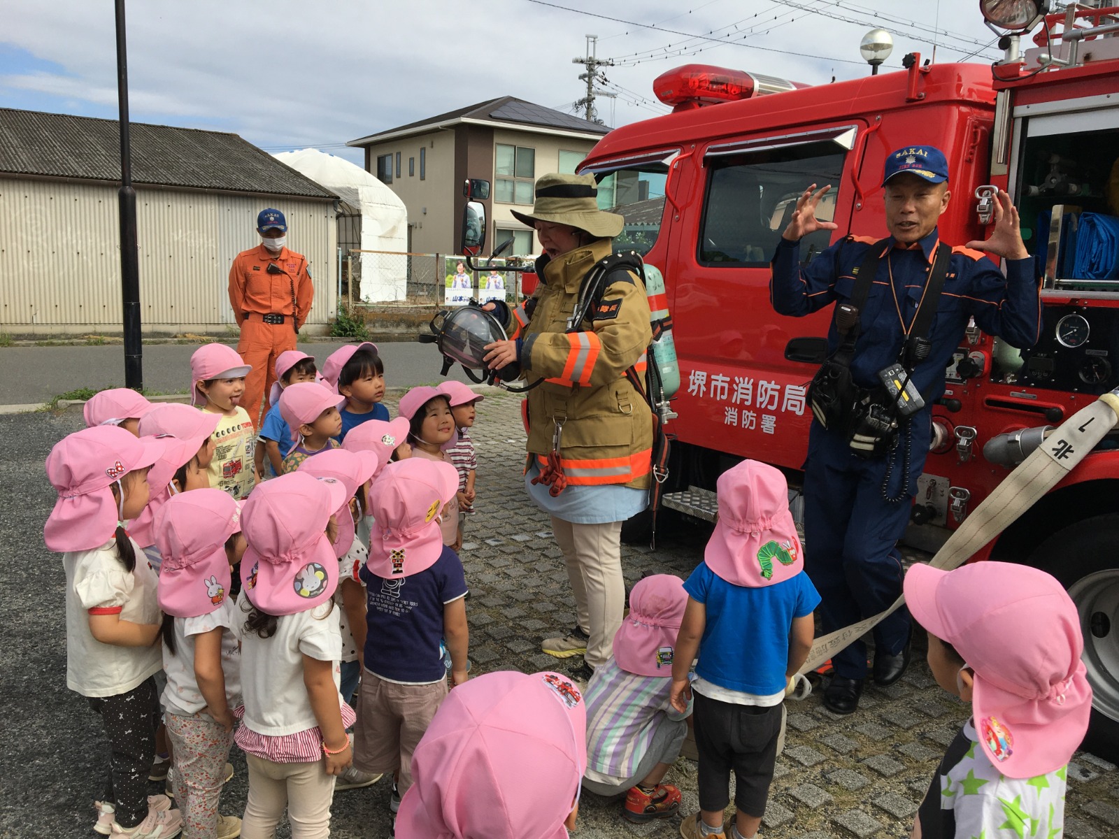 ・消防署立ち会い避難訓練がありました。消防士からお(おさない)、は(はしらない)、し(しゃべらない)、も(もどらない)の約束ごとなどを教えてもらいました。 消防車を近くで見たり触ったり普段隠れているポンプ車の秘密の扉を開けてもらったりしましたよ🚒