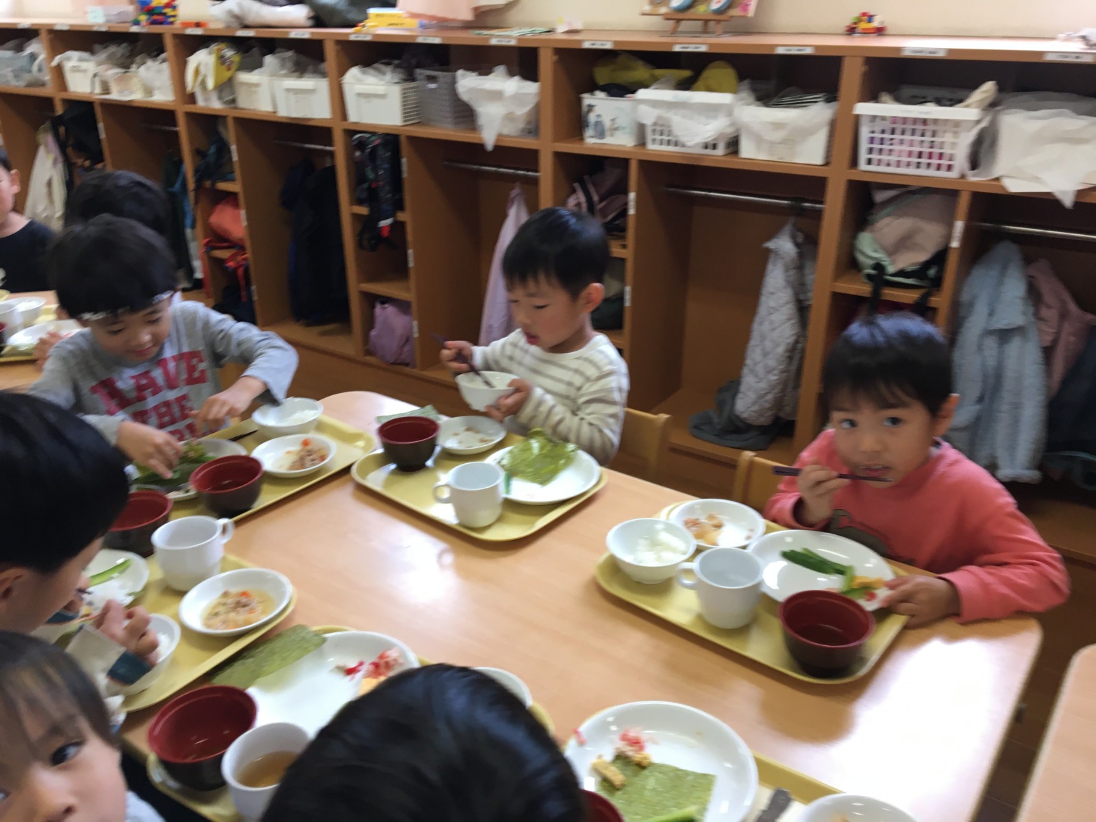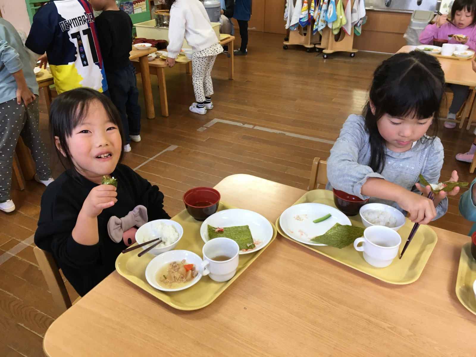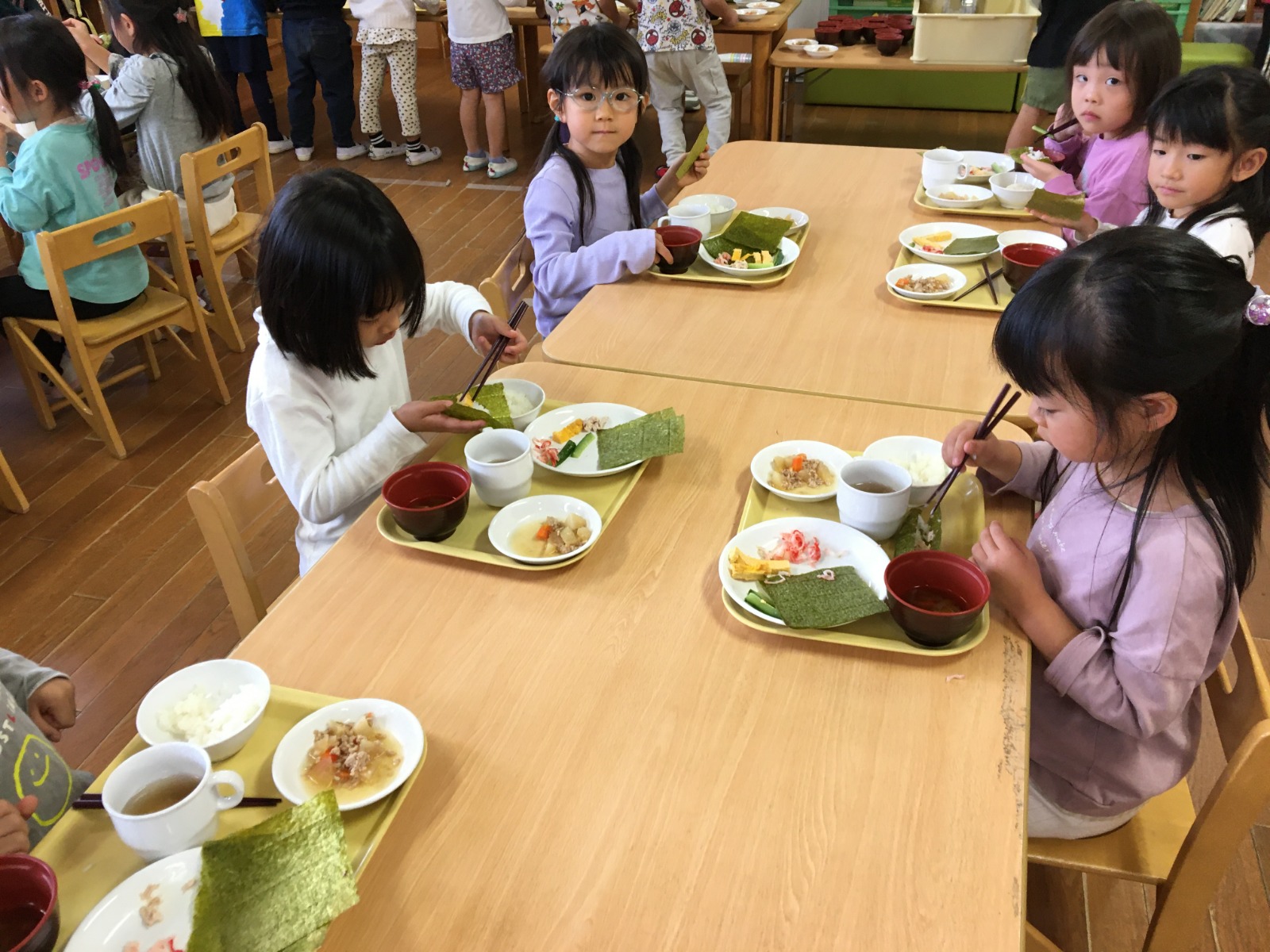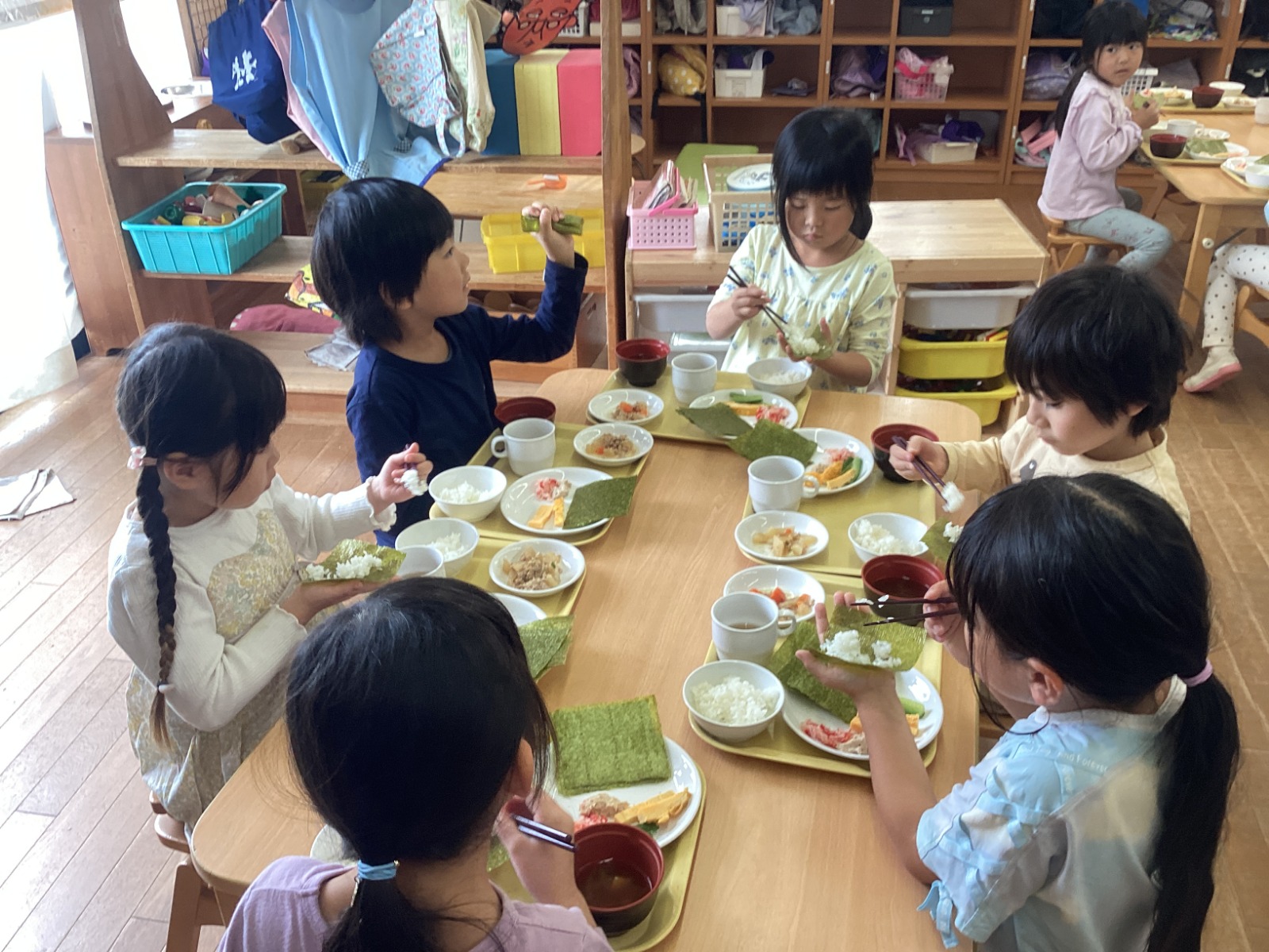 ・手巻き寿司パーティーがありました。子ども達は好きな具材を選んで巻いたり、職員が板前さん風になったりしました。友達とおしゃべりしながら食べる手巻き寿司は格別だったようです💕これからも楽しく食べる経験をしていきたいと思います♪