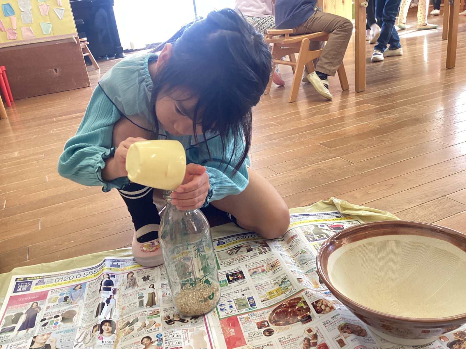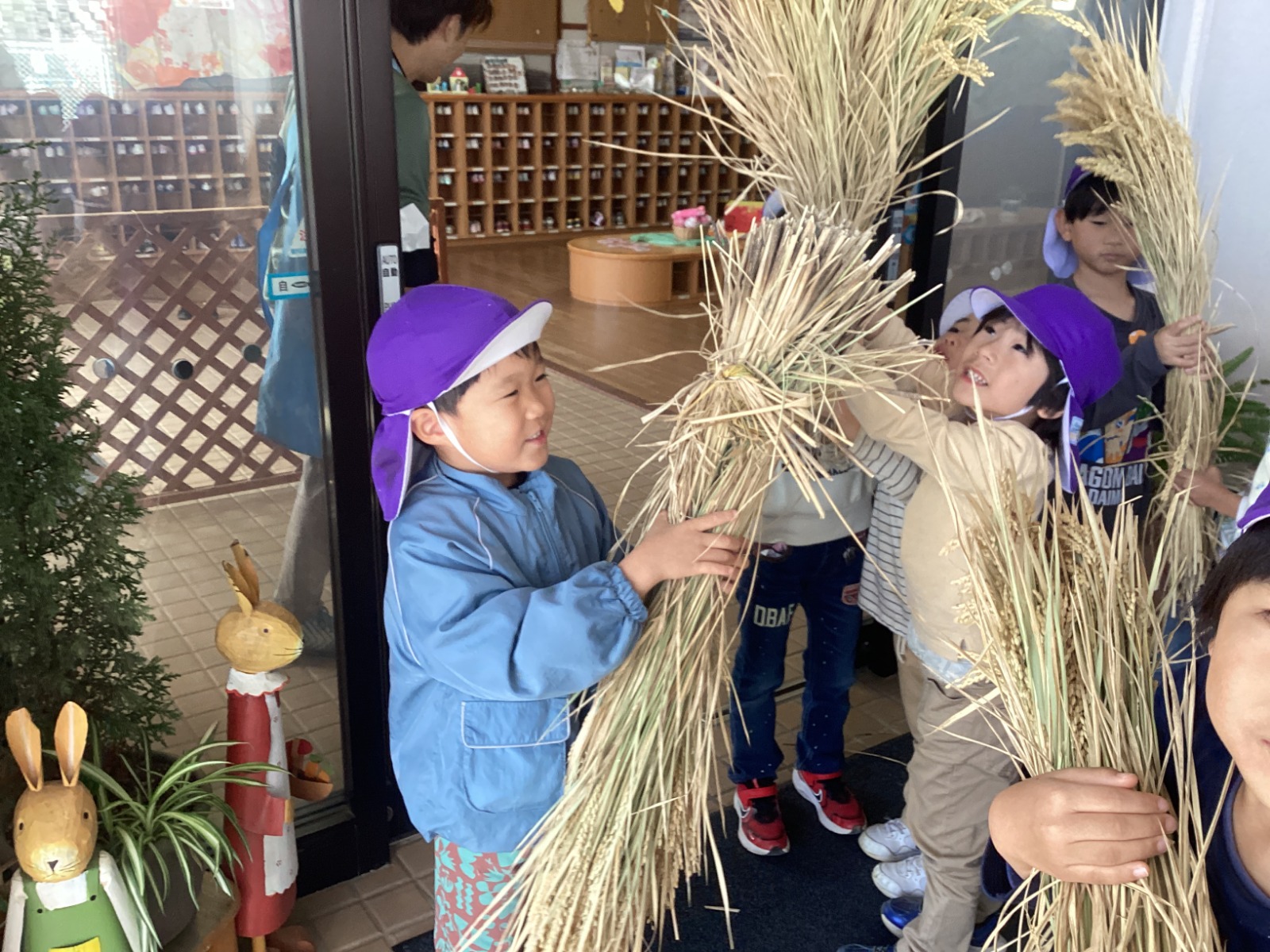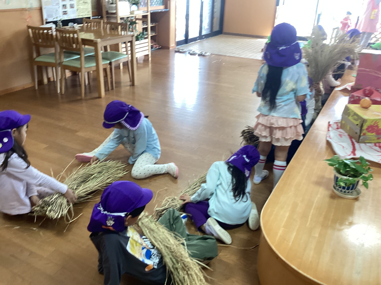 5歳児が稲刈りをして干しておいた稲が乾燥し、脱穀をすることにしました。脱穀やもみすりを全て手作業で行うと、一つ一つの工程にとても時間がかかり、日頃食べている白米のありがたみを感じることができました✨