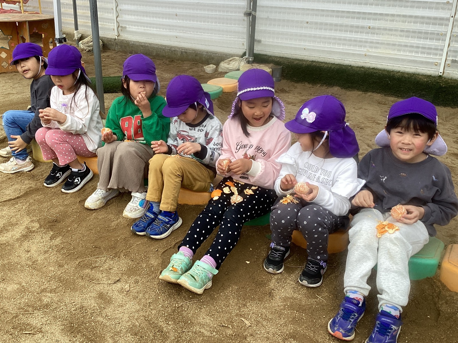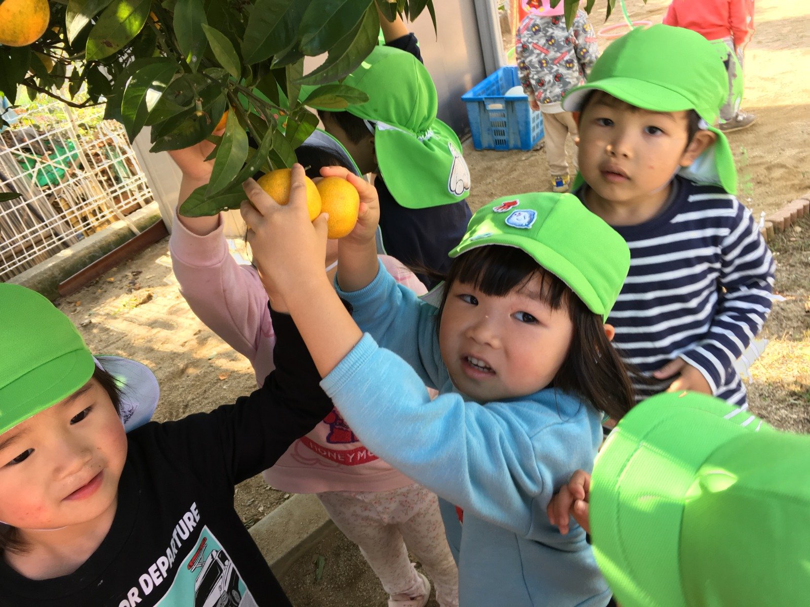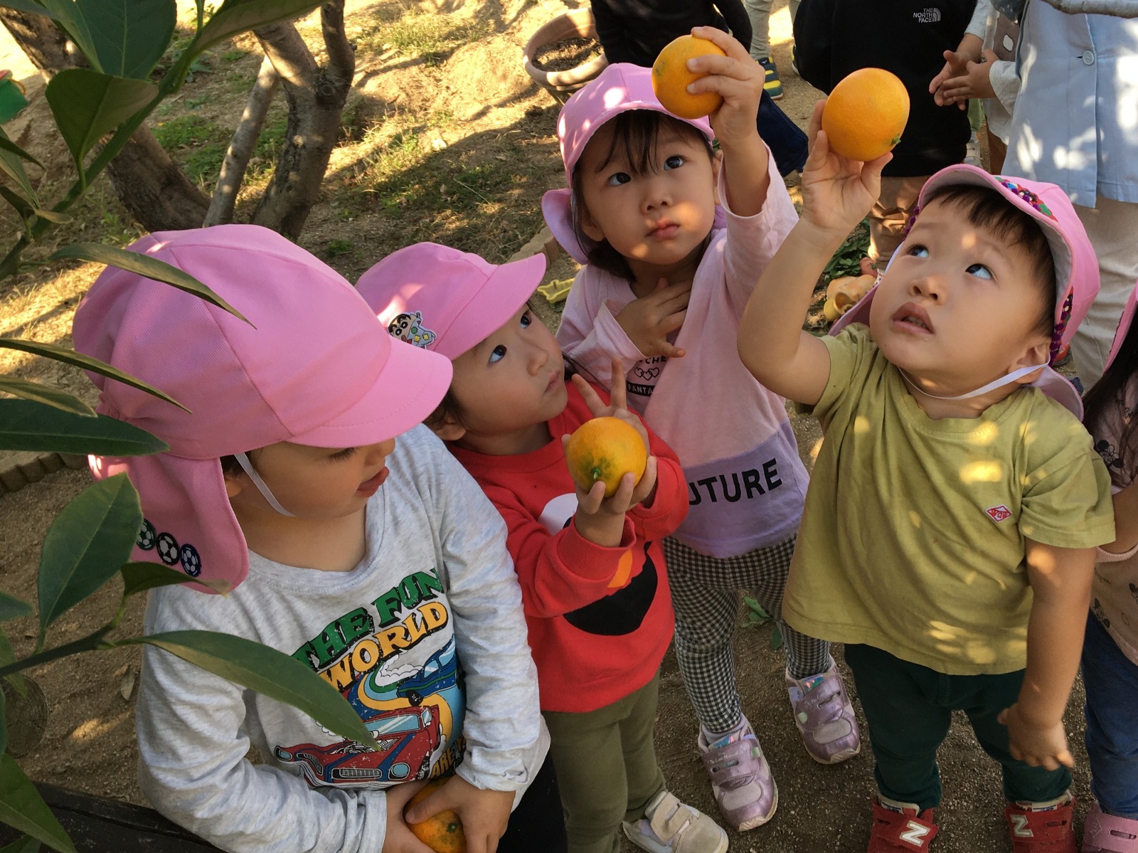 園庭で育った卒園記念樹の温州みかんを収穫して食べました🍊 乳児は保育者の抱きかかえてもらい収穫し、幼児は手をのばして収穫しました。 自分で皮を剥き嬉しそうに友達と食べていましたよ。