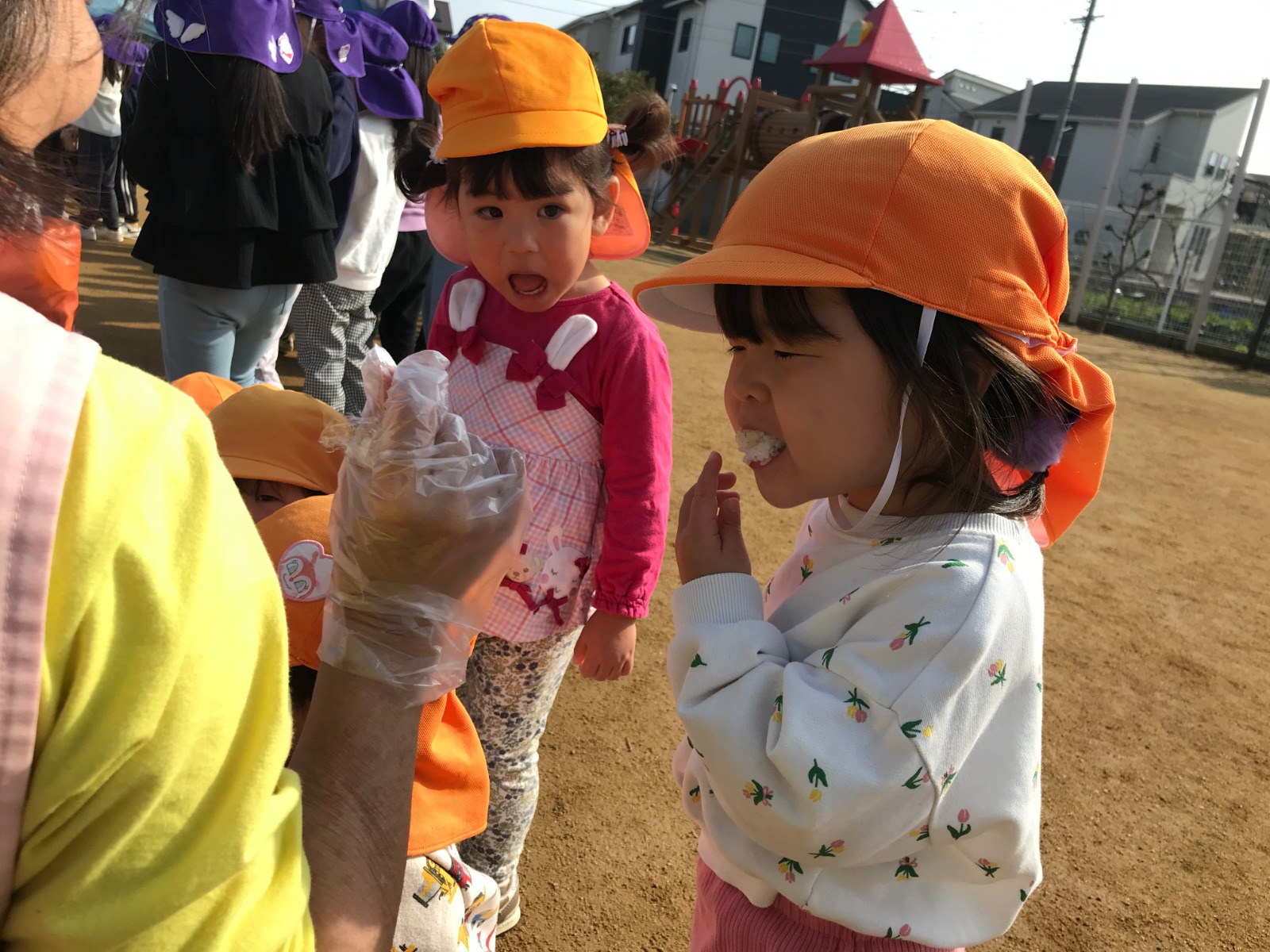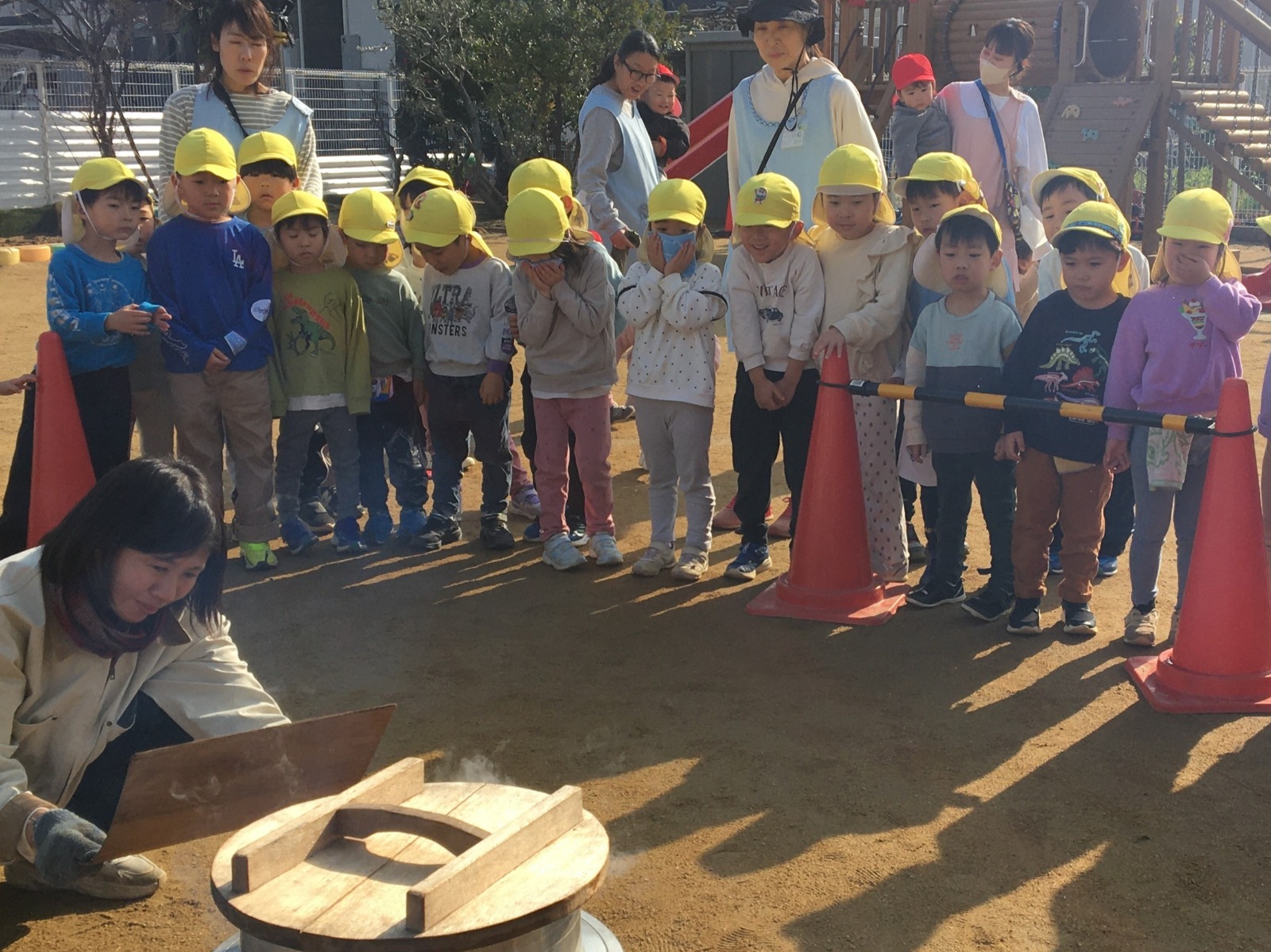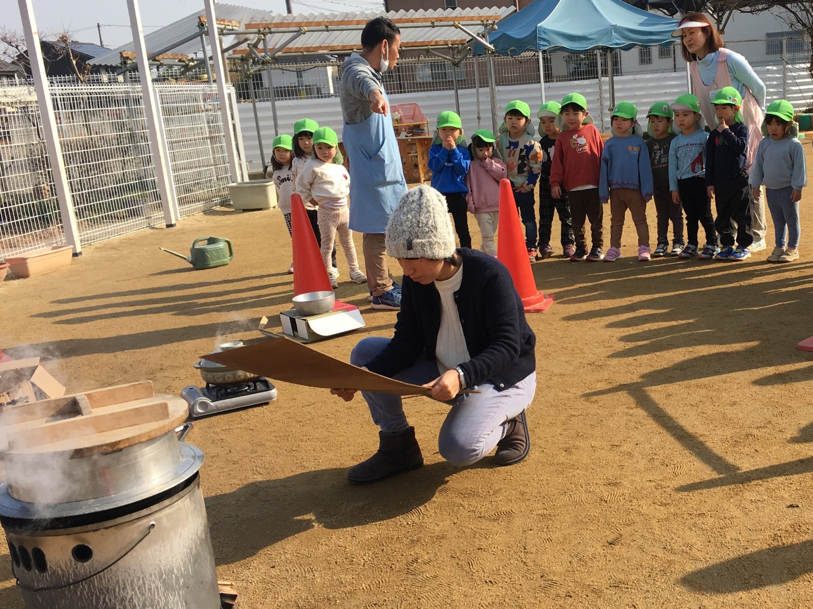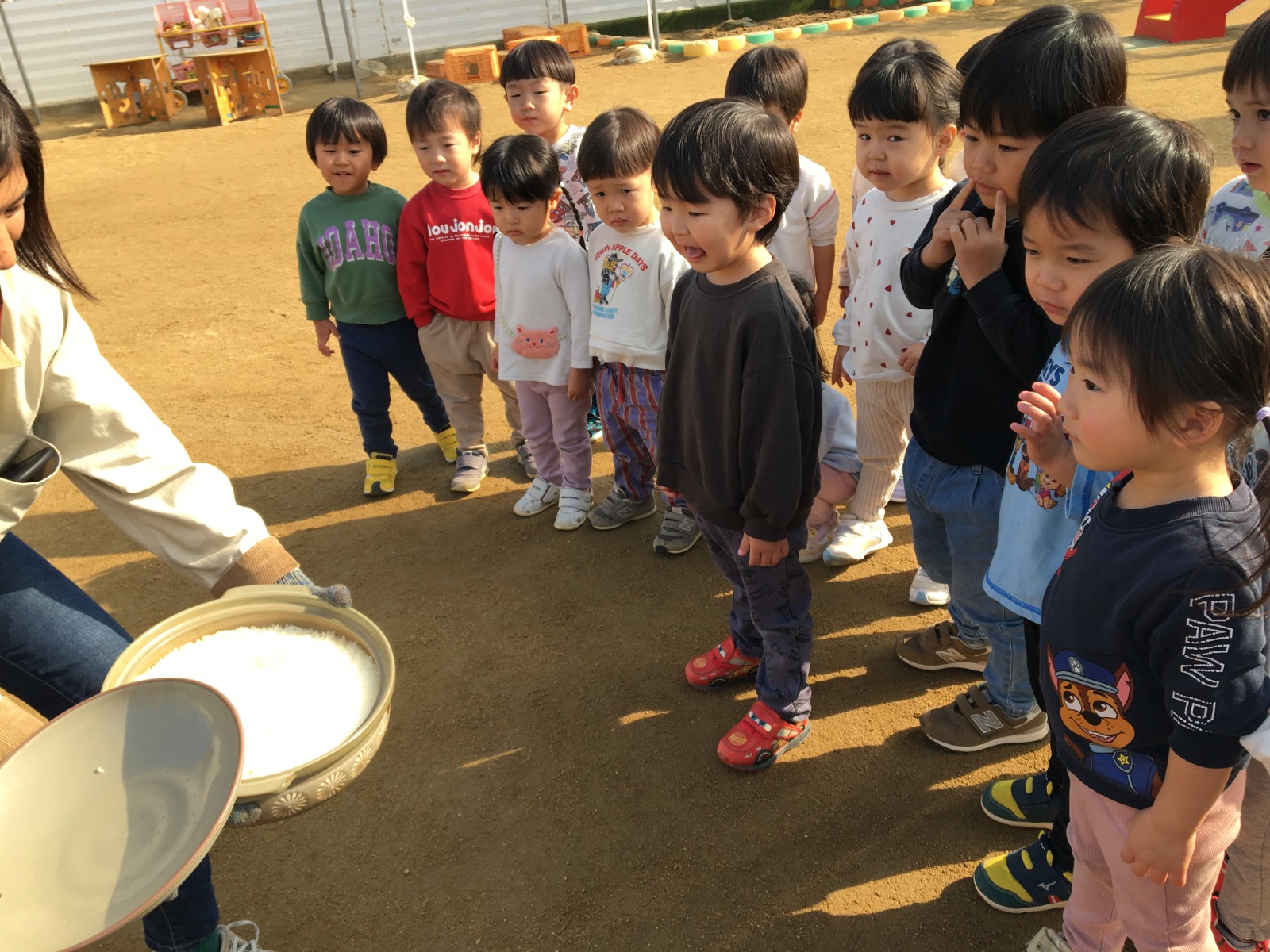 5歳児が田植えや稲刈りをしたお米で炊飯体験をしました。 NPO法人夢プロさんに来ていただき、羽釜で炊きました。 子どもたちは、「においがしてきた!」「湯気が出ている!」と興味深々で見ていましたよ。今回は玄米と白米を炊き、食べ比べをしました。玄米は初めて食べる子どもも多かったのですが、好評でした!羽釜で炊いたご飯はとっても美味しかったです☺