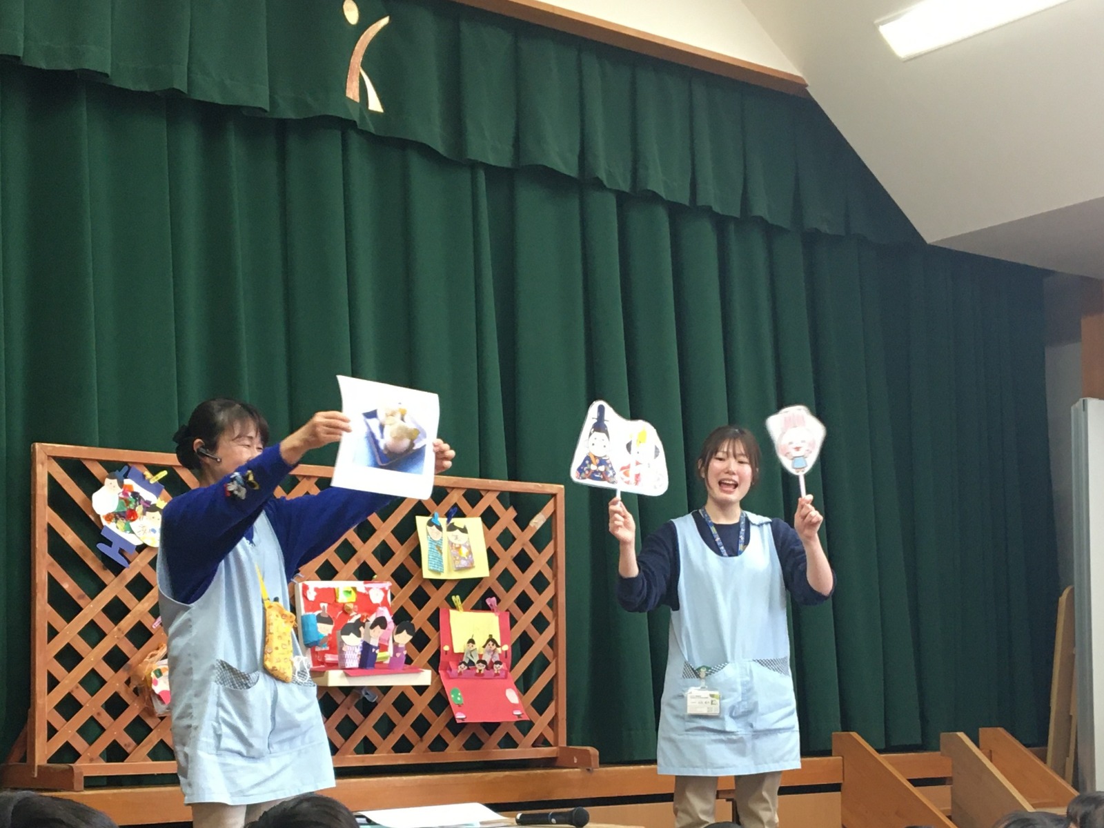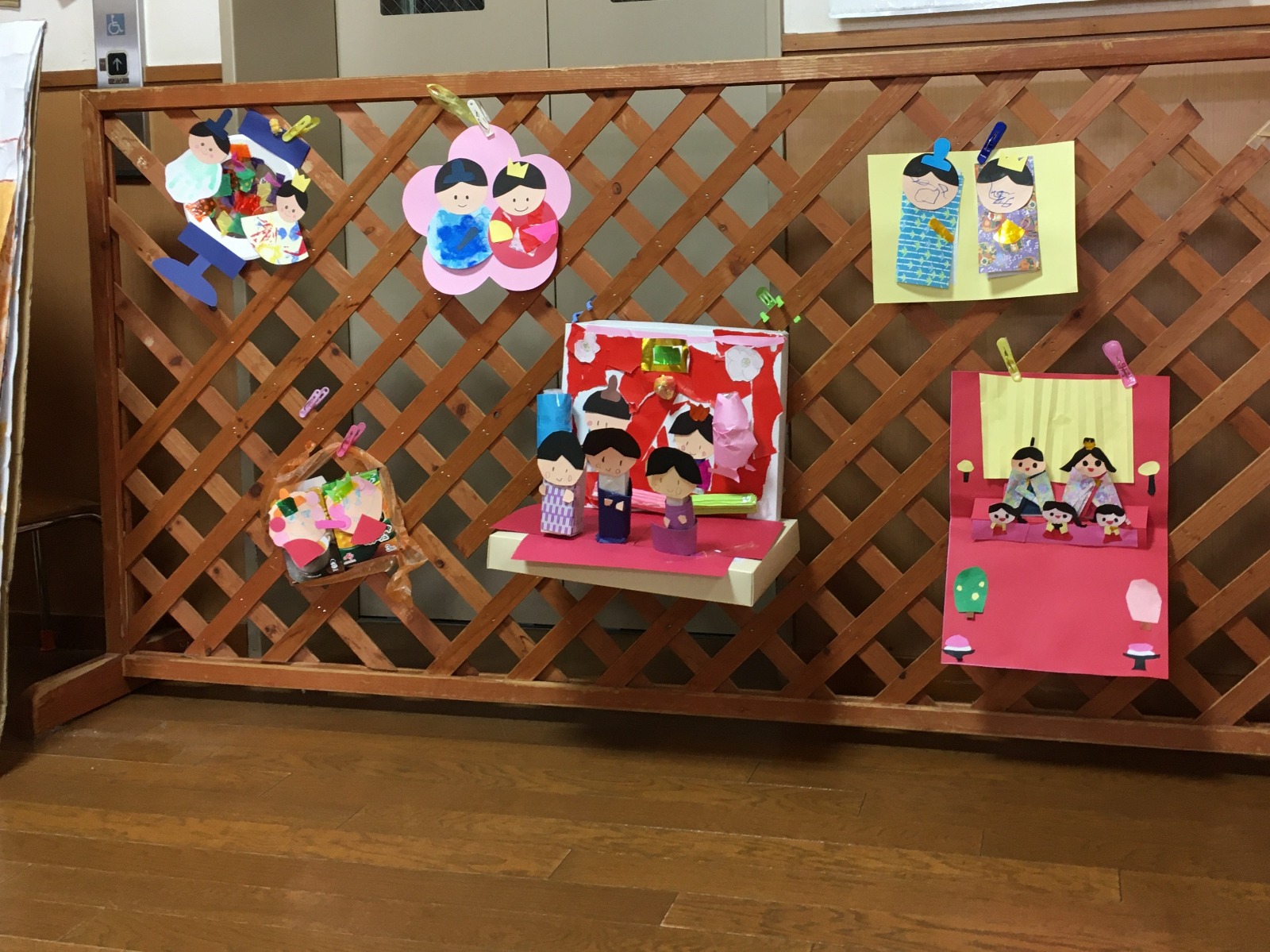 ・ひなまつりの日の集いに参加しました。 由来を聞いたり、他のクラスの作品をみたりしました。 行事参加では地域の方が2組参加されました。集いに参加した後は、ひな祭り製作を作りましたよ。