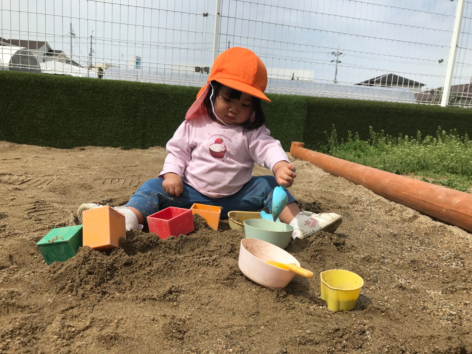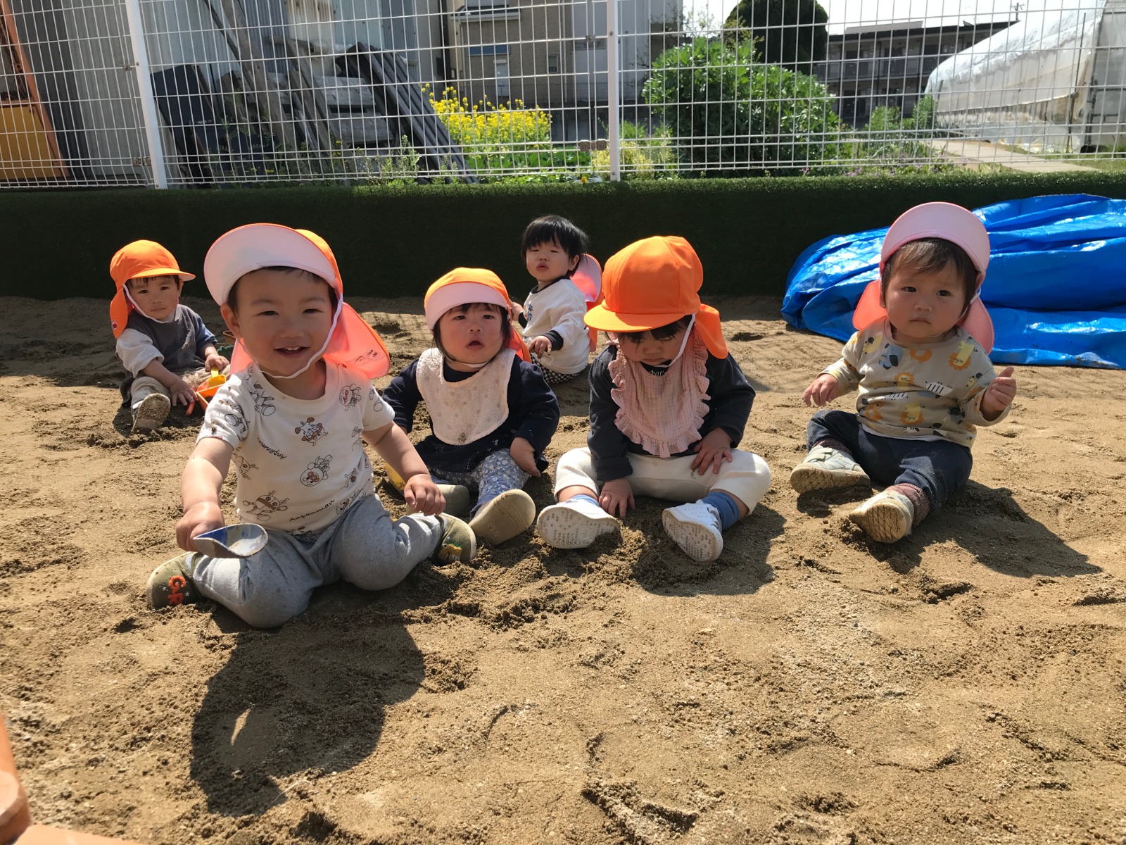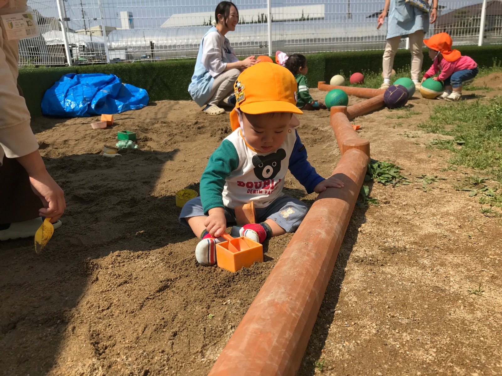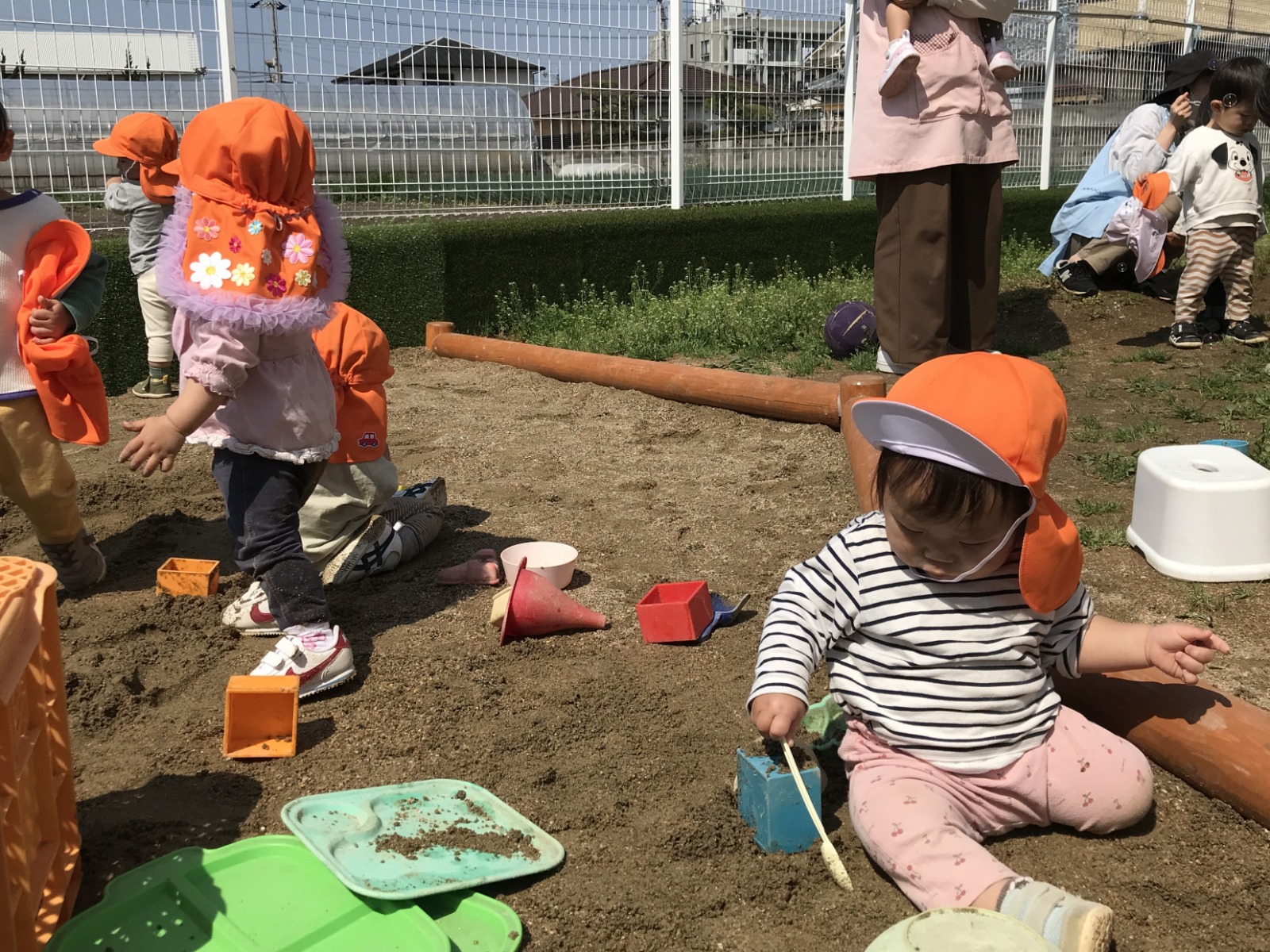 テラスが新しくなりました!砂場ができたので、スコップで砂を掘ったり型抜きをしたり、保育者と一緒にままごとをしたりして楽しんでいますよ♪