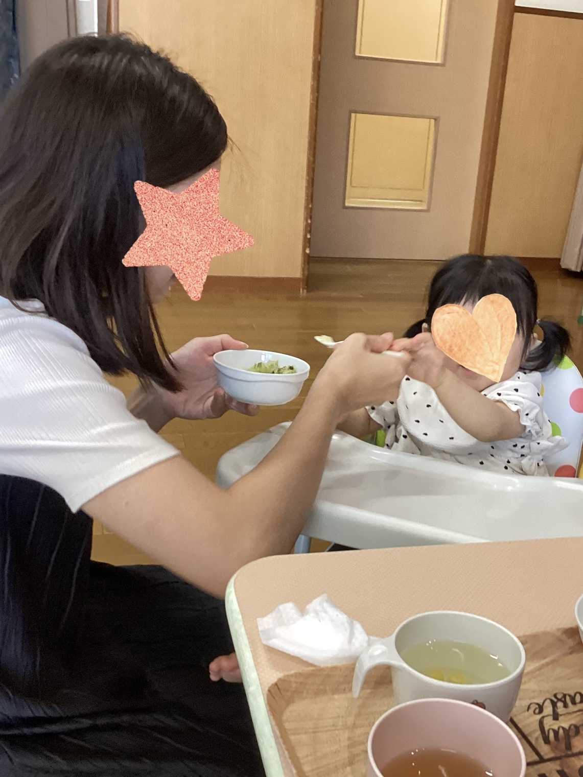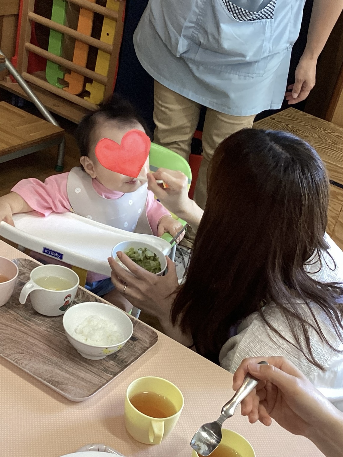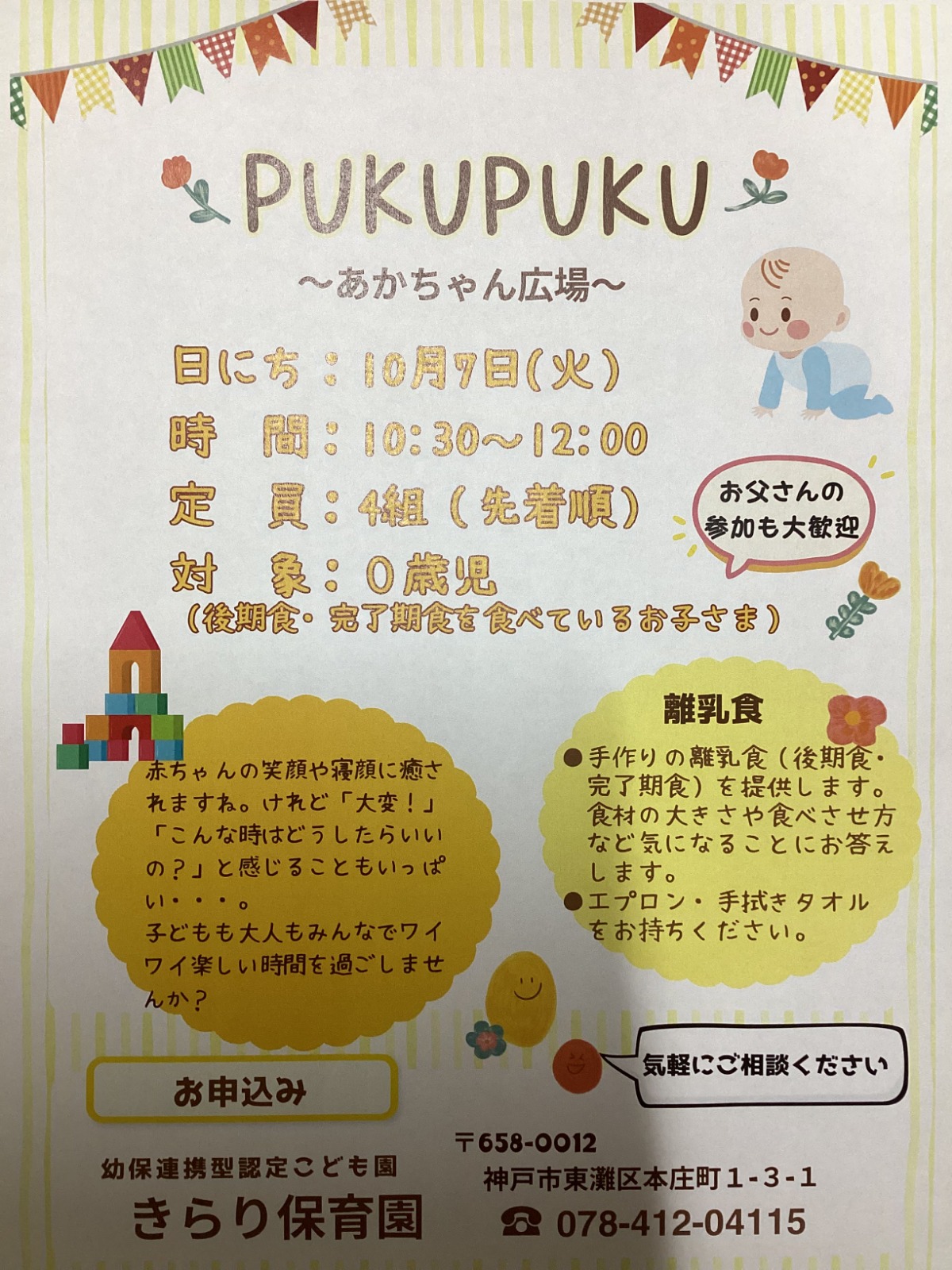 地域の子育て家庭を対象とした『PUKUPUKU~あかちゃん広場~』がありました。0歳児の親子4組が参加し、0歳児クラスの在園児と一緒に遊んだ後、離乳食(後期食・完了期食)を食べてもらいました。穏やかな雰囲気の中、食事や睡眠などちょっとした発達のことをお話しでき、あっという間の時間でした。ホームページやインスタグラムなどで、たくさんの情報を発信していきたいと思います。是非、ご覧ください。