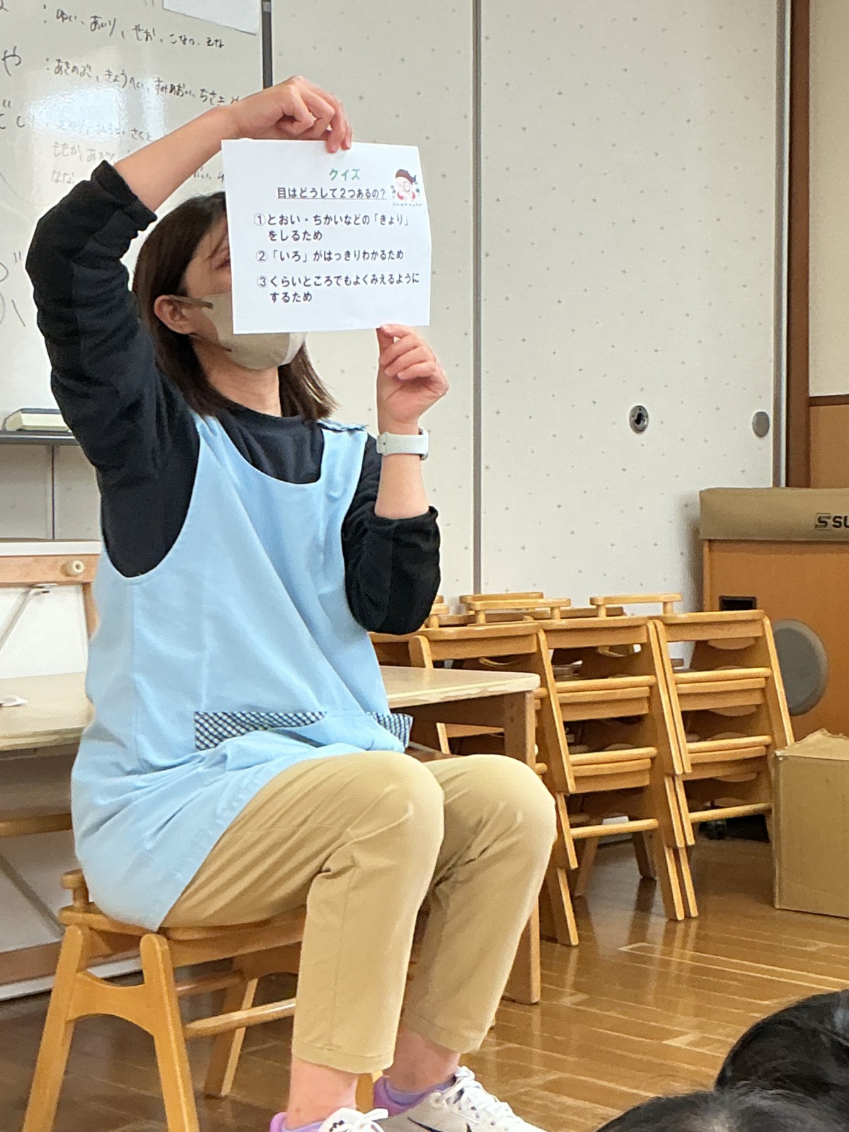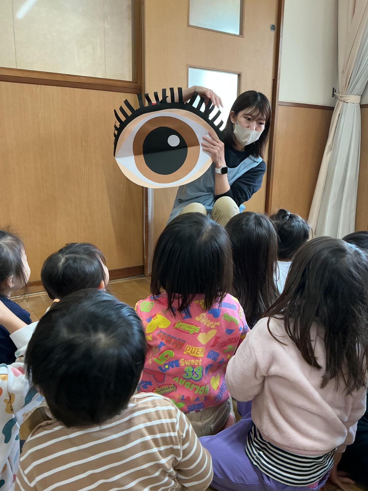 2歳児から5歳児の子ども達に、看護師から『目について』の話がありました。目だけでなく、まつ毛、瞼の役割を分かりやすく教えてもらったり、クイズがあったりと楽しく目の大切さについて学びました。ホームページやインスタグラムなどで、たくさんの情報を発信していきたいと思います。是非、ご覧ください。