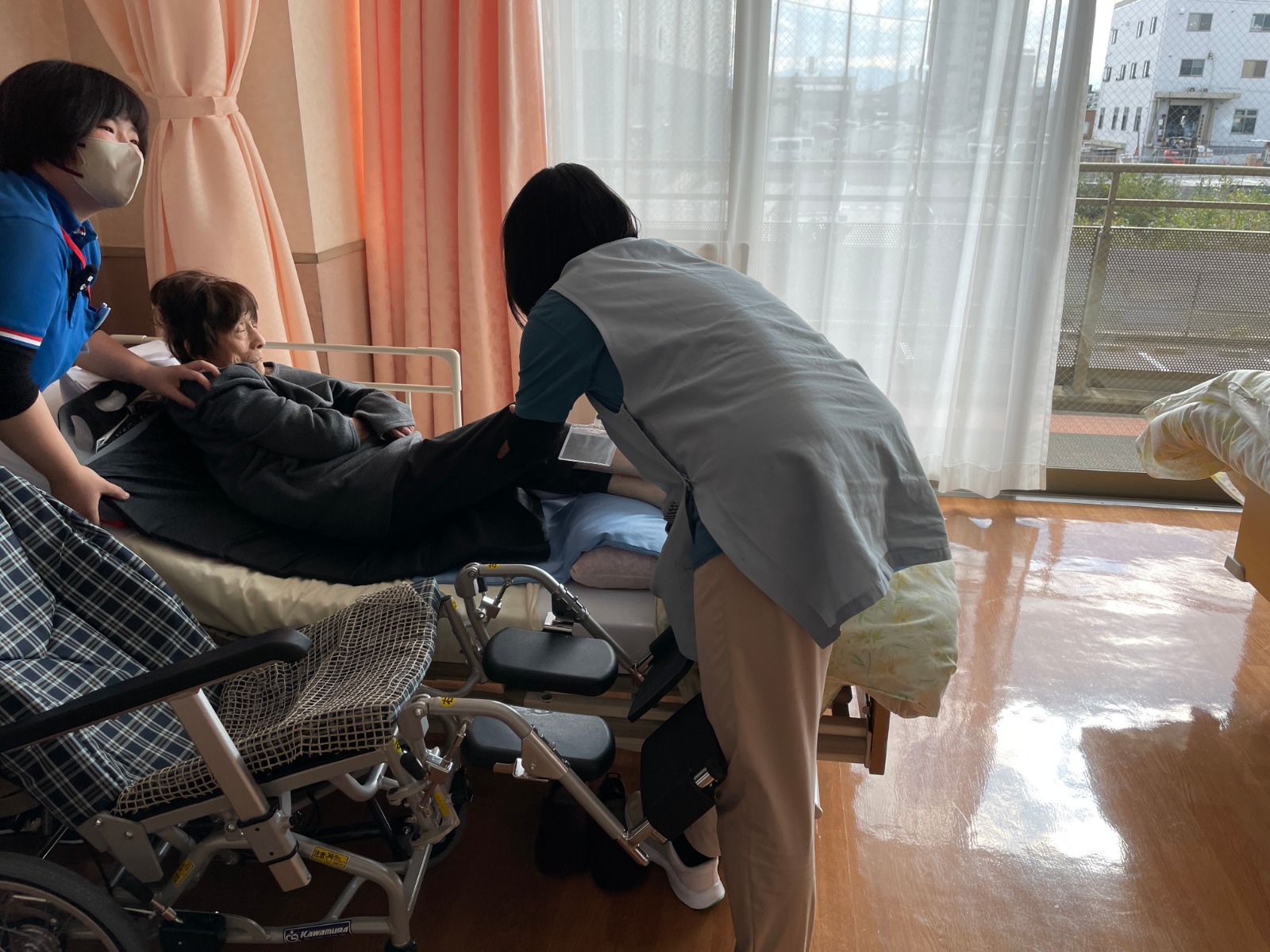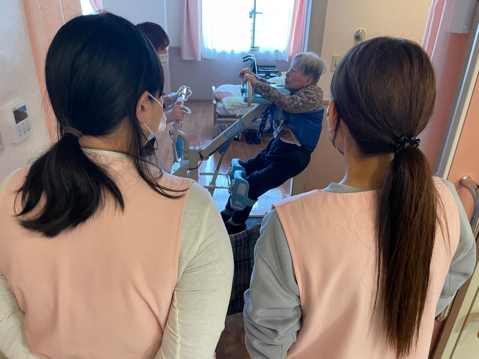 法人内出向研修を実施しました。保育園から3名の職員が遊づるに出向し、介護について学び、ケアの方法やご利用者と実際にコミュニケーションを図るなど、特養での現場を知る機会となりました。また、保育教諭に音楽療法を行ってもらい、普段介護職員だけではできないレクリエーションを実施することで、ご利用者にも喜んでいただくことができました。